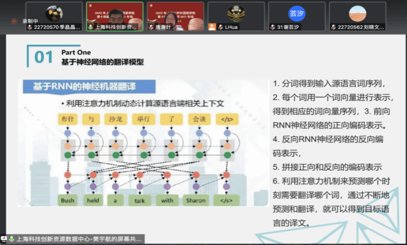 第四位主讲人是上海科技创新资源数据中心数据智能研究院技术负责人樊宇航先生。樊先生同样以“人工智能技术在语言翻译及传播方面的应用与影响”为题,从技术层面介绍了人工智能技术在语言翻译转换方面的应用。樊先生带领大家了解了基于规则的翻译模型、基于统计的翻译模型、基于神经网络的翻译模型以及这三个阶段的机器翻译及其特点。另外,樊先生还就“标签体系”“主题模型”“多模态数据融合”三个方面介绍了应用于文化传播的人工智能。
