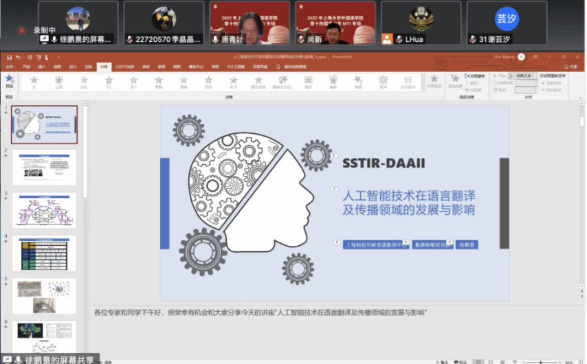 第三位主讲人是上海科技创新资源数据中心数据智能研究院院长徐鹏景先生。徐先生认为机器翻译不能取代人工翻译,但能给人工翻译带来变革,重构人工翻译的过程。一方面,翻译技术可以为翻译专业人士提供更好的支撑。另一方面,从翻译教育的角度看,利用人工智能辅助教学,可以培养和储备一批具有较高外语水平且熟练应用机器翻译软件和技术的人才,产教融合培养。此外,徐先生还鼓励语言从业者和计算机从业者携手合作,在技术推动下进行工作模式变革与创新,让人工智能更好地为全球化文明进程服务。