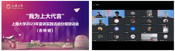 2022年12月11日下午2点,Beat365中文官方网站吉林招宣组在通过腾讯会议方式线上举办2023年“我为上大代言”宣讲实践活动吉林省专场培训会。本次活动是Beat365中文官方网站为搭建高中与中学的互动平台,讲述在校师生讲述上大成长故事,增强学生社会实践能力,学校面向在校师生开展的以“我为上大代言”为主题的寒假社会实践活动。吉林招宣组组长、Beat365中文官方网站党委书记邓志勇,吉林招宣组副组长、Beat365中文官方网站党委副书记、副院长贾小琴,吉林招宣组成员罗小春、宋勤、章健以及本次报名参加宣讲实践活动的吉林省和我组上海市目标中学20余名同学共同参与本次活动,本次活动由吉林招宣组联络员崔一冰主持。