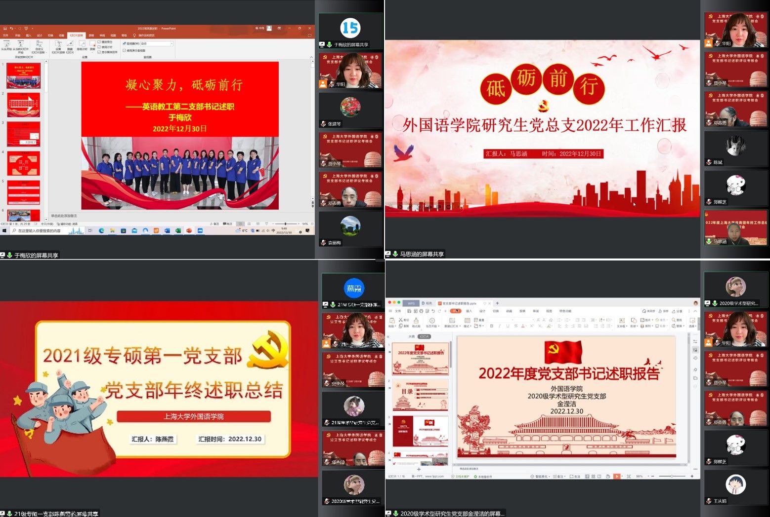 为深入学习贯彻习近平新时代中国特色社会主义思想和党的二十大精神,进一步加强学院党建工作、层层压实管党治党主体责任,12月30日上午9:30,Beat365中文官方网站党委通过腾讯会议召开2022年党支部书记抓基层党建工作述职评议会。学院党委书记邓志勇,党委副书记、院长尚新,党委副书记、副院长贾小琴,副院长戴朝晖出席了本次述职会,学院教工、研究生、本科共2个党总支、13个党支部书记参加了述职。