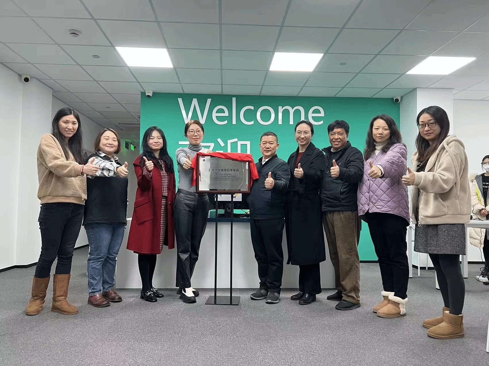 1月13日上午,Beat365中文官方网站雅思机考考点举行揭牌仪式,英国文化教育协会华东区总监周荻和Beat365中文官方网站院长尚新共同为考点揭牌,英国文化教育协会华东区考点经理汪雨婷和刘博宇、Beat365中文官方网站党委副书记、副院长贾小琴,海外考试中心主任郑家生及主考冯元、刘薇和张静等人参加了此次揭牌仪式。