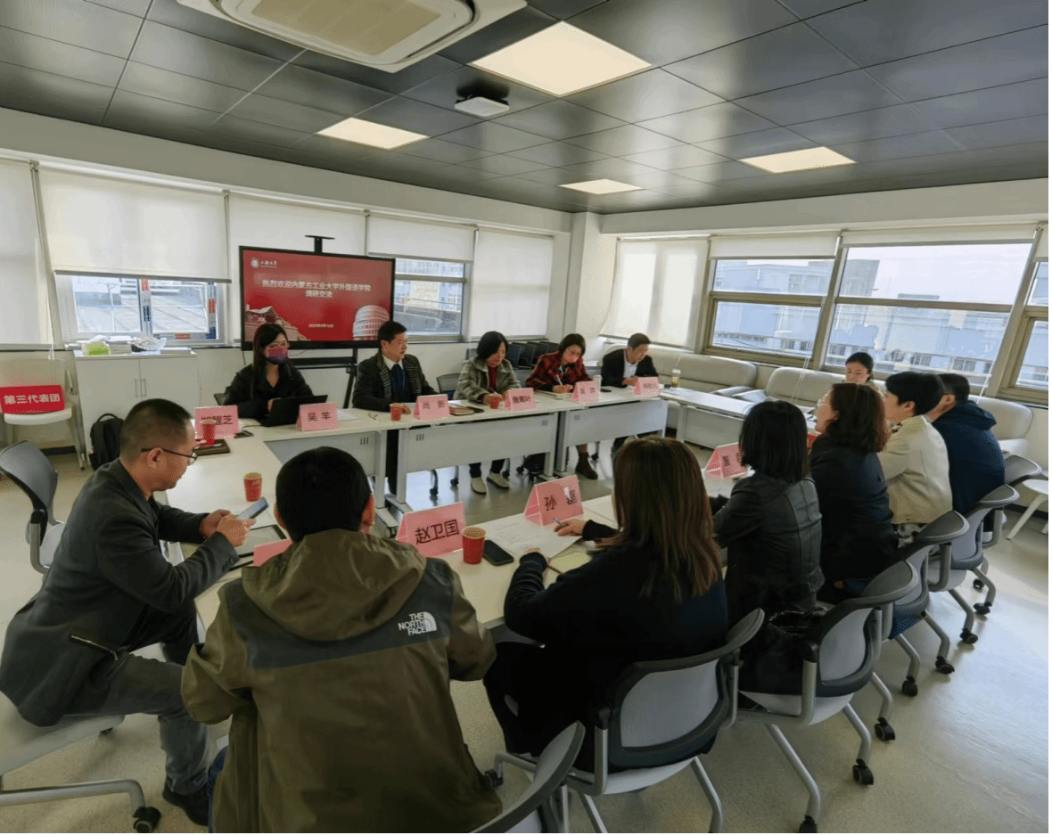 2023年3月16日上午,内蒙古工业大学Beat365中文官方网站院长董君一行来访Beat365官网,双方在C501会议室进行了交流探讨。会议由院长尚新主持,副院长唐青叶、英语系教授傅敬民、英语系副主任龚萍、大学外语教学部副主任吴羊、MTI教育中心副主任花亮、院办主任郑醒芝等出席了会议。