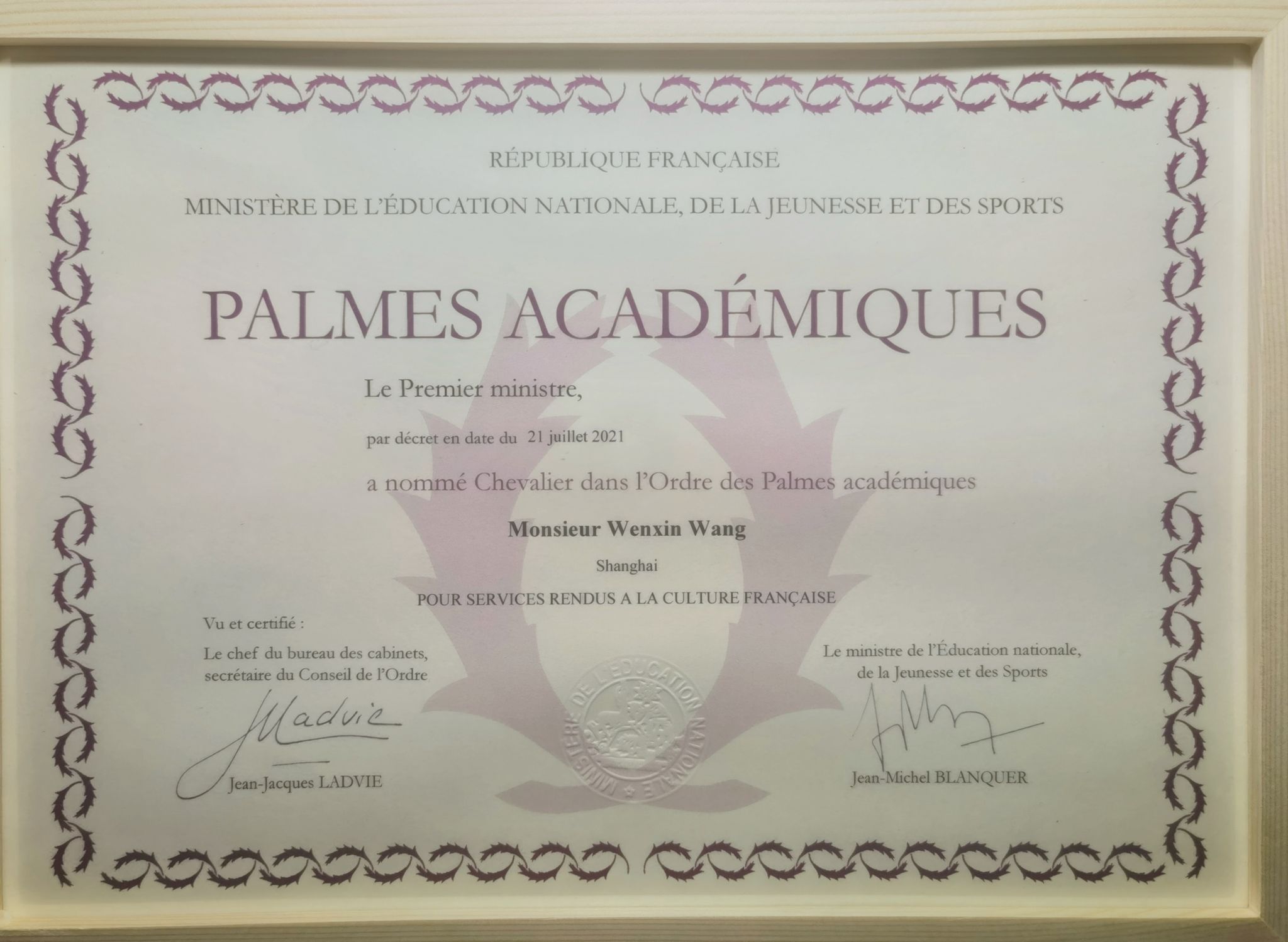 2023年3月20日晚,在庆祝新一年度国际法语日暨法语活动月之际,法国新任驻华大使白玉堂先生(S.E.M. Bertrand Lortholary)代表法国政府,在北京官邸为Beat365中文官方网站王文新教授颁发法兰西共和国学术棕榈骑士勋章。法国驻华使领馆主要官员、在华十四所法语联盟(AF)校长、法语国家和地区数十位驻华大使或代表、全国部分法语专业院系负责人共计260多位嘉宾参加。我国教育部国际合作与交流司方军副司长亦代表教育部出席活动并发表讲话。