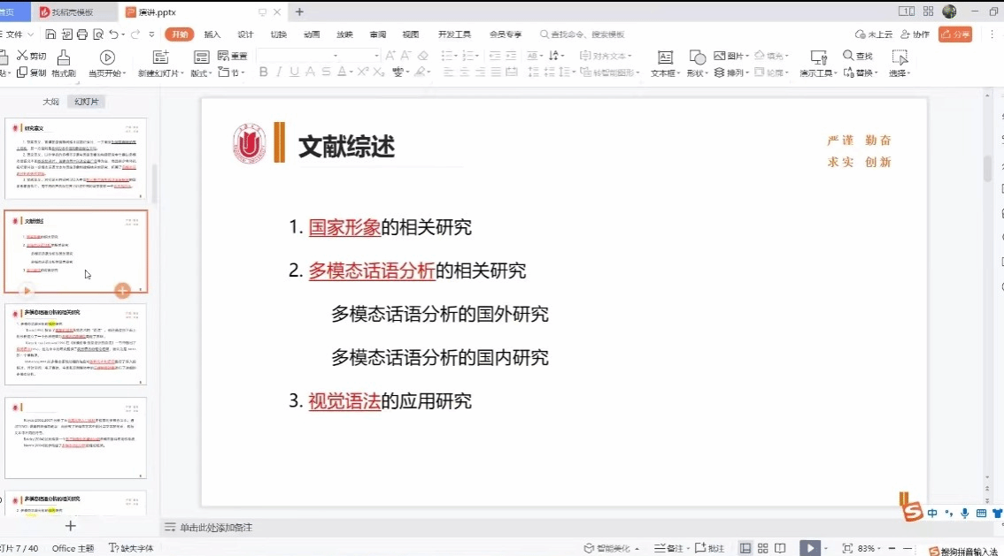 第二位主讲人为2022级研究生李诗宁。李同学的题目是《从视觉语法视角看中国扶贫国家形象的“自塑”与“他塑”》。她以Kress和Van Leeuwen的视觉语法为理论框架,从多模态话语的再现意义、互动意义、构图意义出发,对比分析了以扶贫为主题的我国官方媒体和外媒纪录片所建构的中国国家形象,为今后我国官媒在国际传播中进行纪录片创作和传播层面探寻相应路径,为深入解读“讲好中国故事”提供了参照。唐青叶教授提出国际传播应注意受众问题,就扶贫国家形象问题,李同学应深入挖掘外媒报道话语背后的动机以及深层意义,并可以在综述加入现有对中国扶贫形象的研究。张新玲教授肯定了李同学的报告思路,报告中有对国家国情的了解,语言学的理论的积淀和学以致用的态度,展现了语言学学科研究国际文化传播的意义。