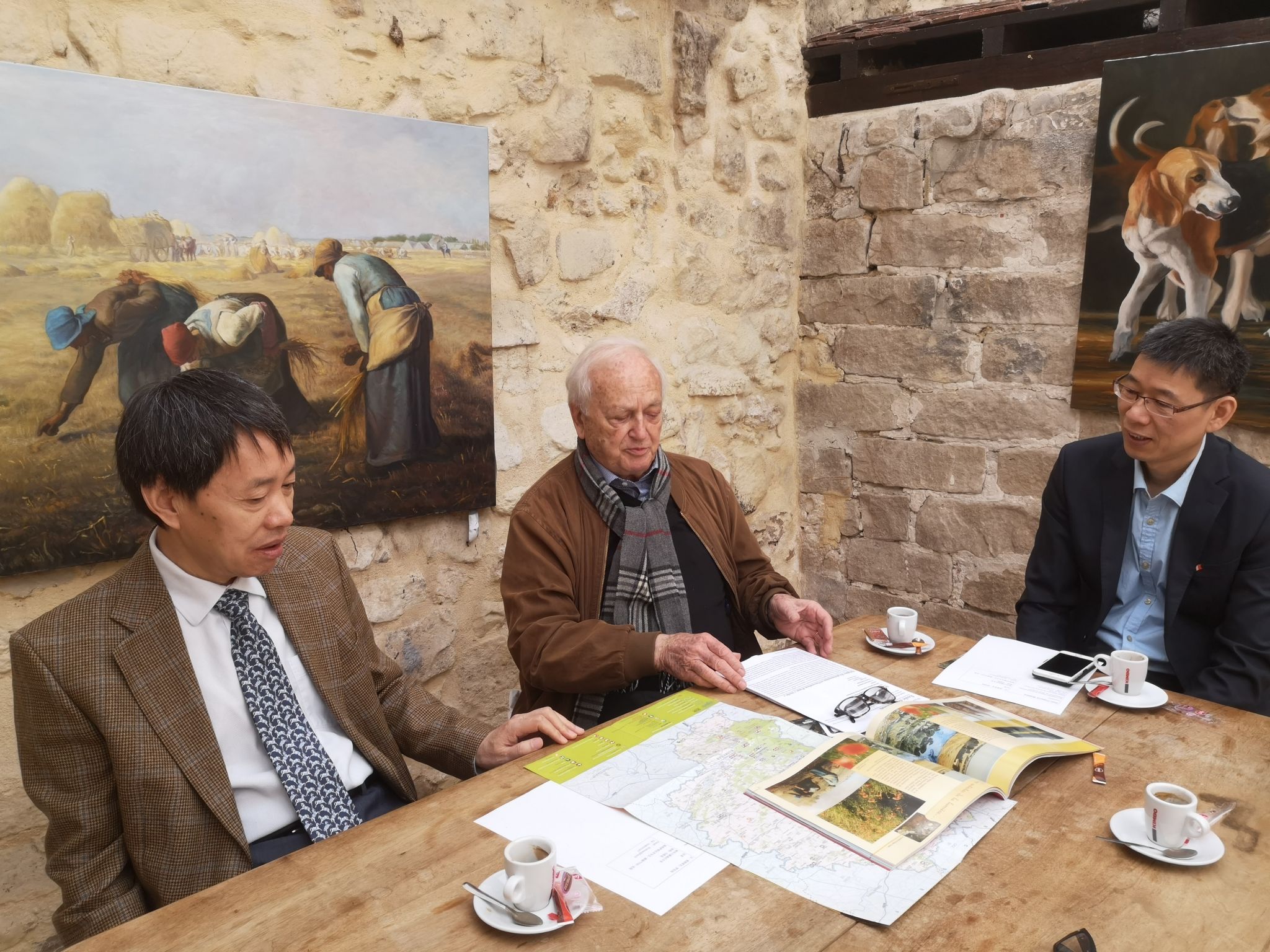 户思社至今与许多法国友人仍保持了良好的友谊。图为户思社与法国朋友商谈“中法最美小镇”合作