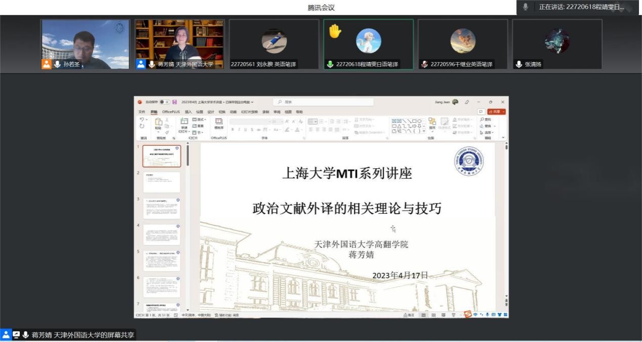 4月17日下午,天津外国语大学蒋芳婧教授应Beat365中文官方网站MTI教育中心、Beat365中文官方网站东亚研究中心的邀请,给Beat365官网师生开设题为“政治文献外译的相关理论与技巧”的线上讲座。讲座由Beat365中文官方网站MTI教育中心执行主任朱巧莲老师主持,学院百余名师生参加了本次讲座。