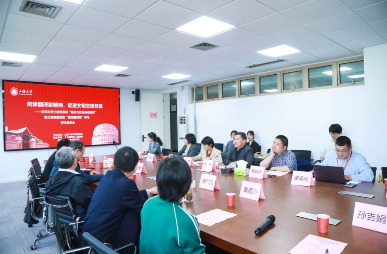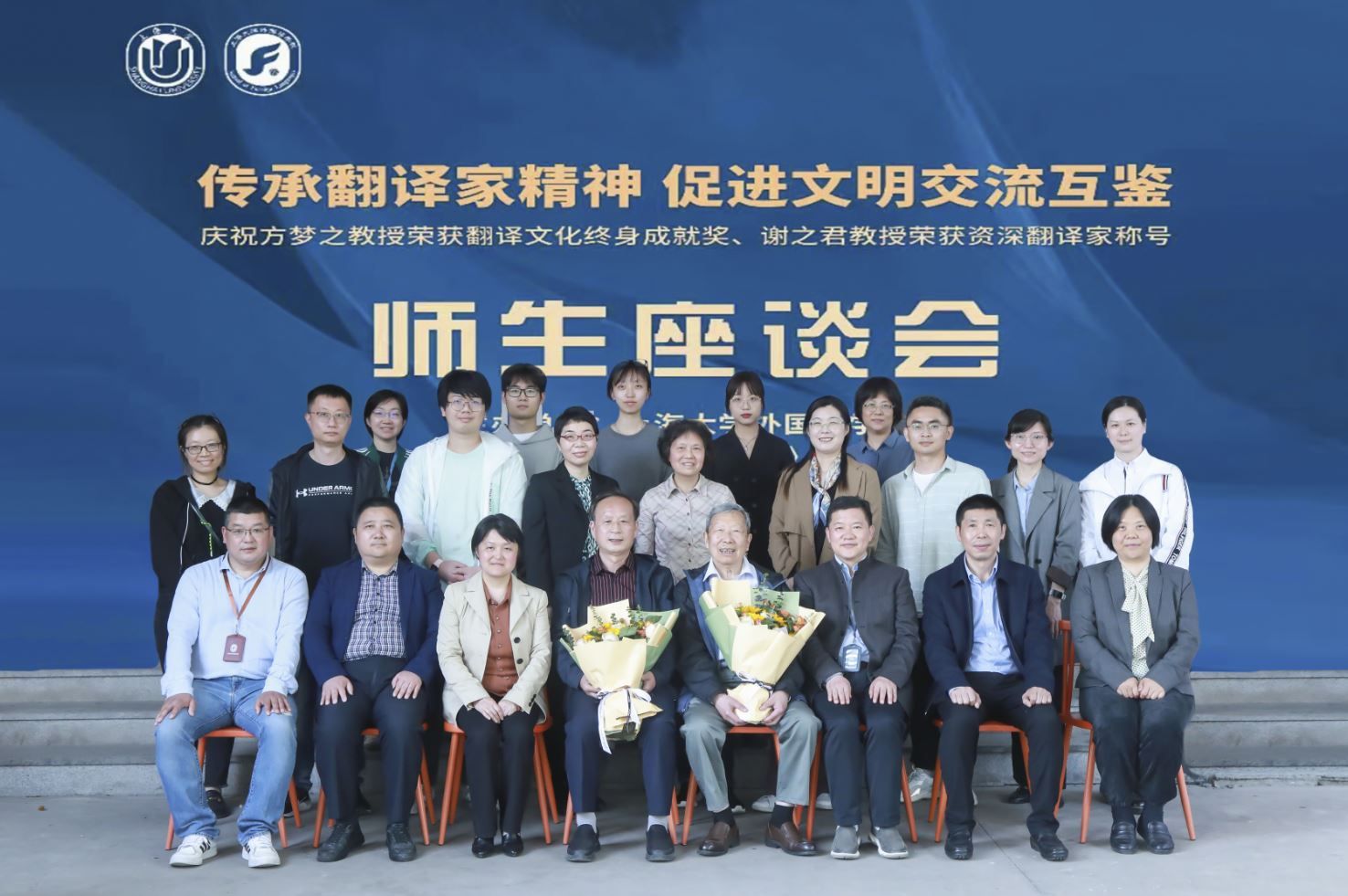 2023年4月17日下午,为庆祝方梦之教授荣获中国翻译协会“翻译文化终身成就奖”、谢之君教授荣获“资深翻译家”称号,题为“传承翻译家精神,促进文明交流互鉴”的师生座谈会在校本部C506成功举办。本次活动由Beat365中文官方网站院长尚新教授主持,Beat365中文官方网站党委书记吴蔚、《上海翻译》主编傅敬民教授等多名Beat365中文官方网站领导和《上海翻译》编辑部成员,以及青年教师代表和学生代表出席活动。