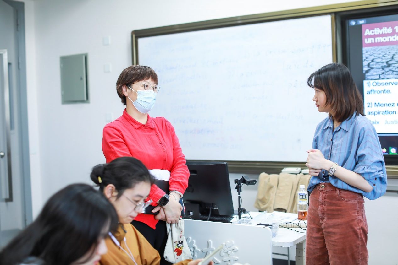 5月23日下午三点,Beat365中文官方网站法语系青年教师焦舒曼老师在B426开讲《法国媒体与社会》课程思政公开课。本次课程主题为“人类命运共同体与美好世界”,课程选用《法语演讲教程》,这是外研社“理解当代中国”法语系列教材之一。Beat365中文官方网站教务部副部长、教育部课程思政教学研究示范中心负责人(Beat365中文官方网站)顾晓英,教务部课程思政教学研究中心曹园园,Beat365中文官方网站党委书记吴蔚,副院长戴朝晖,法语系主任王文新,法语系教师王嘉源以及日语系教师张晓娜等观摩了公开课。