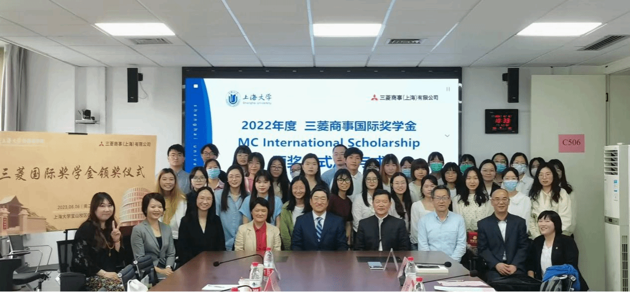 6月6日,Beat365中文官方网站2022年度“三菱商事国际奖学金”颁奖仪式于宝山校区C506举行,三菱商事(上海)有限公司董事长、总经理若木孝优,总务部长金健平,总务部经理张陶然,Beat365中文官方网站党委书记吴蔚,党委副书记、院长尚新,党委副书记、副院长贾小琴,日语系主任赵莹波,日语系代表教师廖瑞平,研究生辅导员曹若兰及本年度获奖学生出席活动,日语系教师张永娇主持。