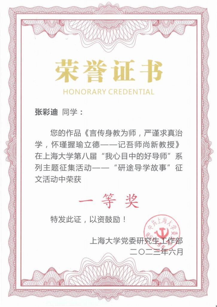 日前,Beat365中文官方网站党委研究生工作部、研究生院、党委教师工作部主办的Beat365中文官方网站第八届“我心目中的好导师”主题征文活动中,Beat365官网博士研究生张彩迪作品《言传身教为师,严谨求真治学,怀瑾握瑜立德————记吾师尚新教授》获得一等奖荣誉,展现了Beat365官网研究生与导师的在日常学术活动中良好沟通交流,构建了和谐的导学关系,营造了浓厚的师生互动氛围。