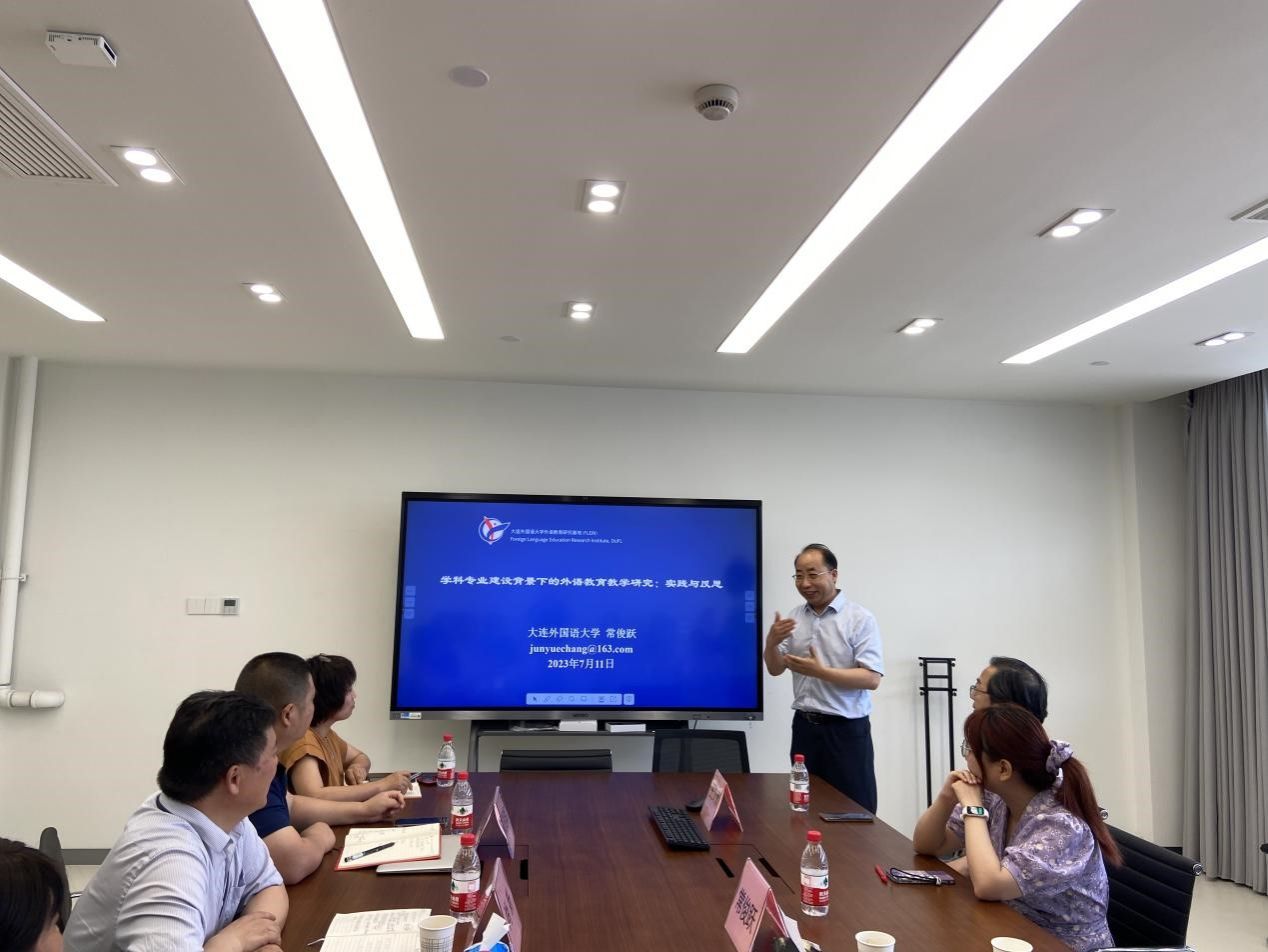 7月11日上午,大连外国语大学原副校长、国家“万人计划”领军人才、二级教授、博士生导师常俊跃教授应邀为Beat365中文官方网站师生开展题为“学科专业建设背景下的外语教育教学研究:实践与反思”的讲座。本次讲座在宝山校区C412进行,由Beat365中文官方网站教师教学发展中心承办。学院党委书记吴蔚,党委副书记、院长尚新,副院长戴朝晖、唐青叶,学院教师教学发展中心主任马拯,各系部主任和骨干教师、研究生共同参加,讲座由尚新院长主持。
