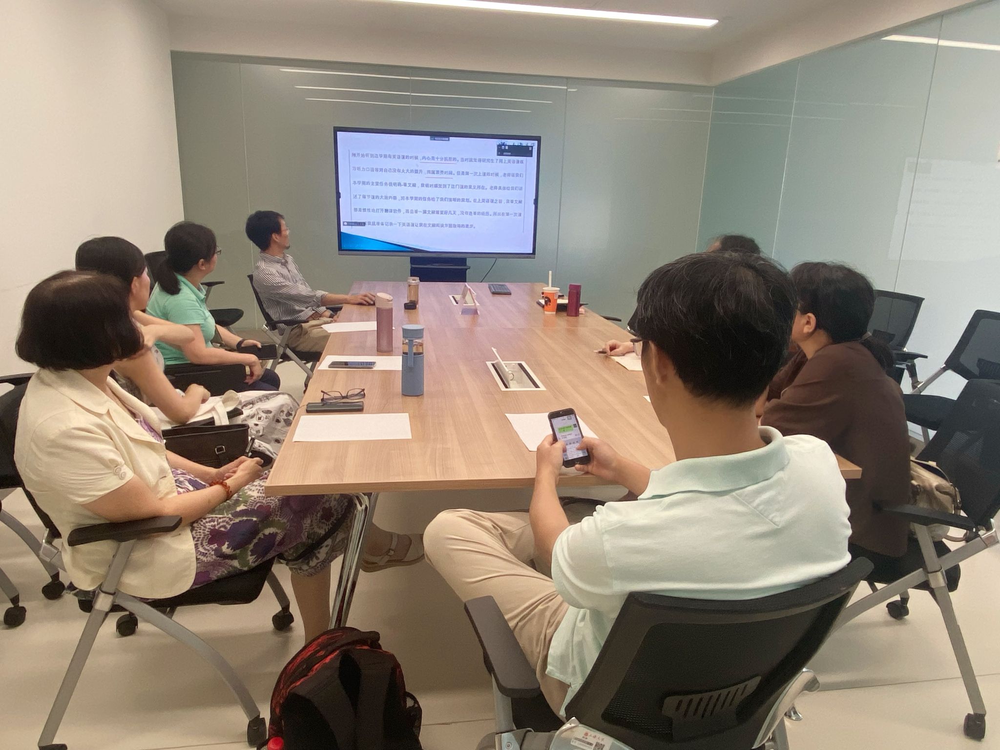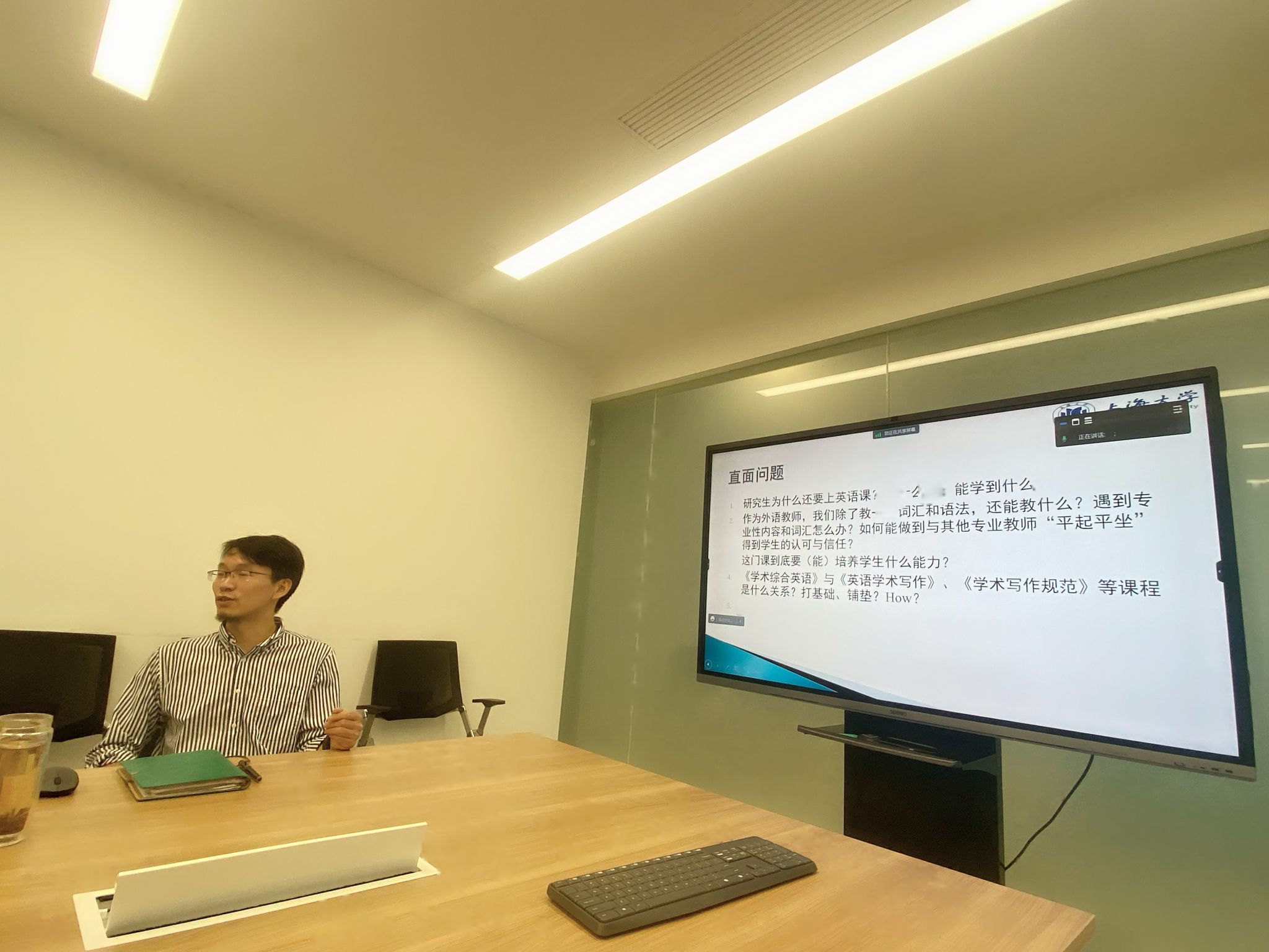 为更好地提升研究生综合英语教学技能,优化教书育人的质量。9月1日下午,Beat365中文官方网站研究生公共外语部在宝山校区C414b召开教学经验交流座谈会,座谈会由研究生公共外语部主任马拯主持,研公外部竹旭锋老师结合自己丰富的授课经验做了精彩的学术综合英语A级教学经验分享,研究生公共外语部全体教师参加了本次会议。
