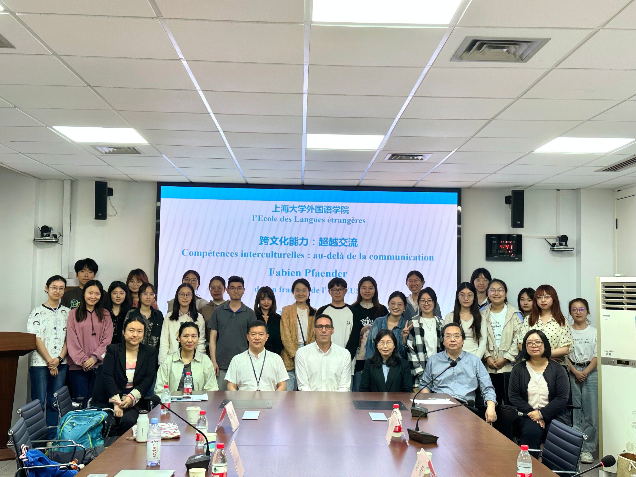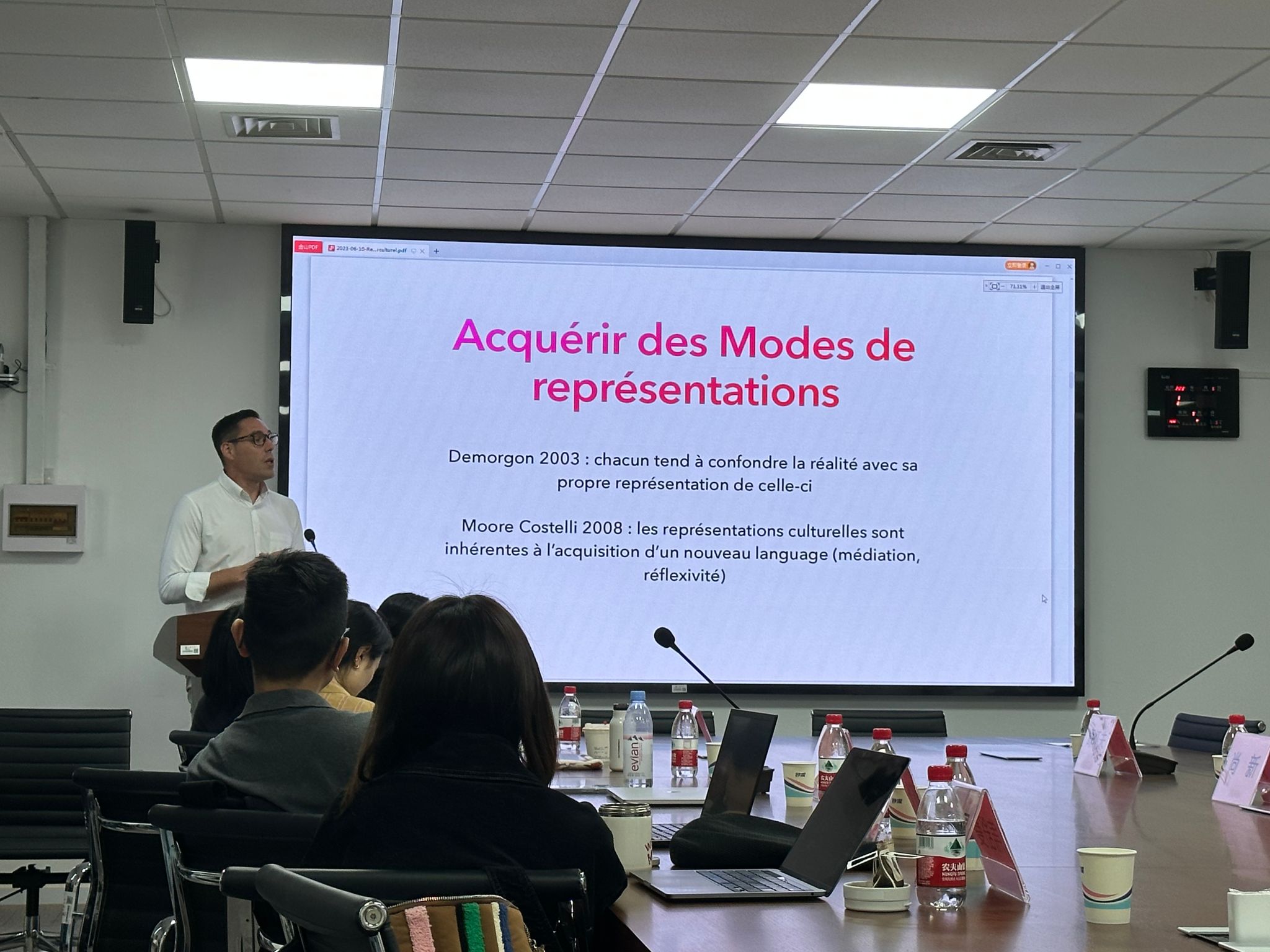 10月26日下午,Beat365中文官方网站法语系邀请中欧学院Fabien Pfaender院长开设题为“跨文化能力:超越沟通”(compétences interculturelles : au-delà de la communication)的讲座。Beat365中文官方网站党委副书记、院长尚新、副院长阚怀未出席,法语系主任王文新主持,法语系全体师生参加了活动。
