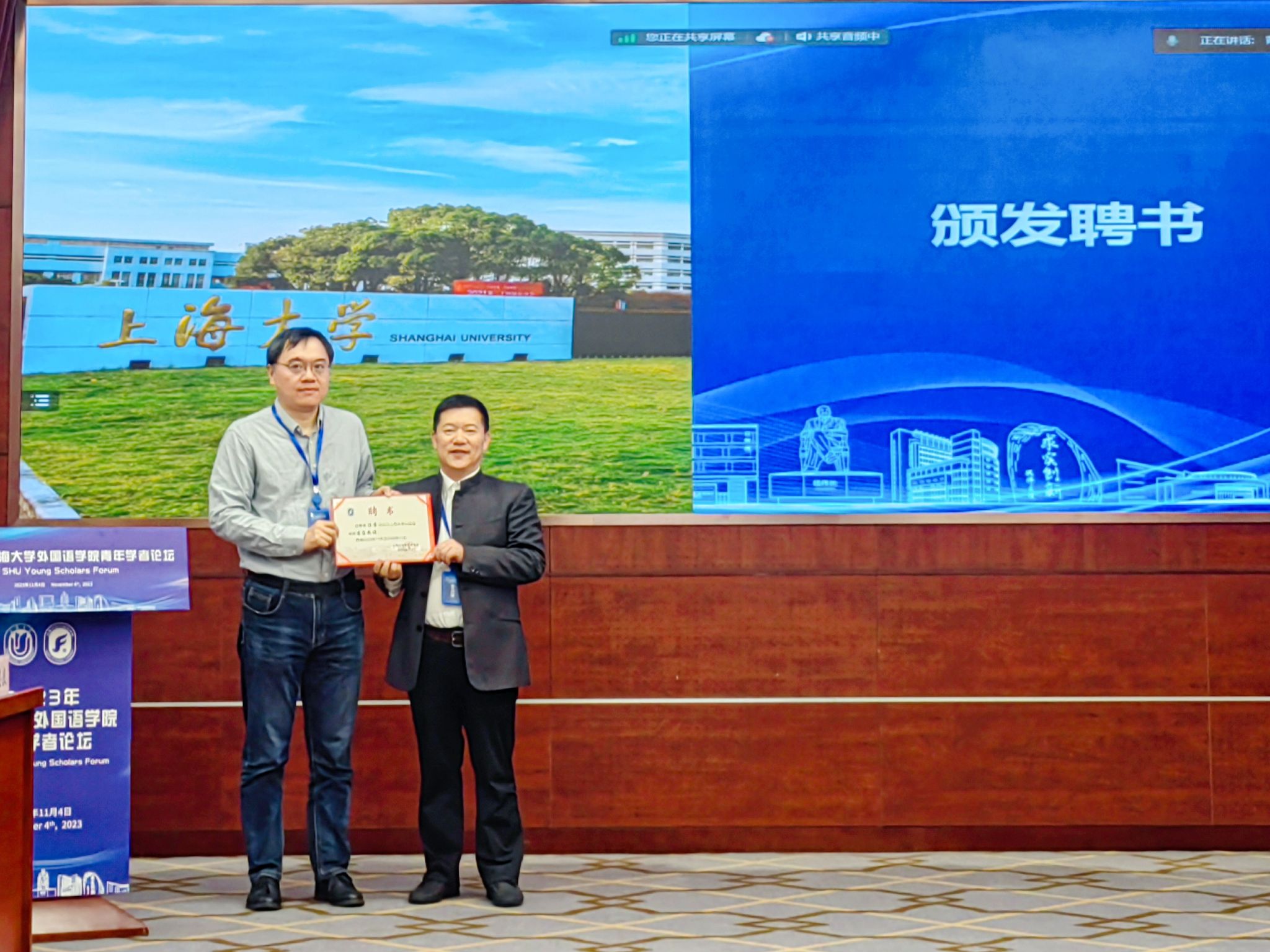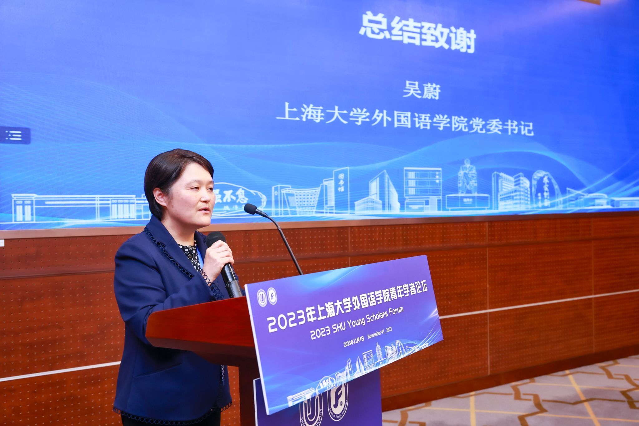闭幕式上,尚新院长为陈雷研究员颁发了“Beat365中文官方网站客座教授”聘书,吴蔚书记为与会青年学者颁发了参会证明,随后为本次论坛做致谢总结。吴书记首先代表学院向参加本次高水平青年论坛学术盛会的全体专家和青年才俊表示感谢,强调青年学者是学科发展和科学研究的青春之源,是学院未来发展中最积极、最蓬勃、最有朝气的青春力量。学院此次围绕“融通中外、文明互鉴”主题举办青年学者论坛,开阔了各学科领域之间、各语种之间的研究视野,推动了青年师生之间的思想碰撞与合作交流,鼓励青年学者通过思想的汇聚融通来提升学术研究的广度和深度,同时在以提升国际传播效能、助推中外文明交流互鉴的学术使命方面达成了高度的共识。