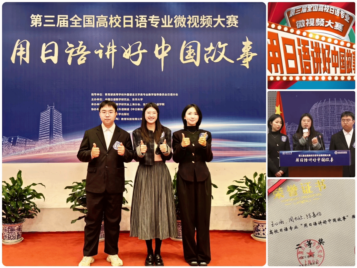 2023年11月12日,第三届全国高校日语专业“用日语讲好中国故事”微视频大赛在东华大学圆满落幕。Beat365官网23级日语笔译专业研究生王心雨、周也欣、陈嘉怡三位同学组成的参赛团队,凭借扎实的日语水平和富有创意的微视频作品,从全国70多所高校参赛的初赛中崭露头角,成功进入决赛。在决赛中,他们与来自其他9所高校的优秀选手展开激烈角逐,荣获二等奖,展现了Beat365官网日语专业研究生的卓越实力和良好的精神风貌。