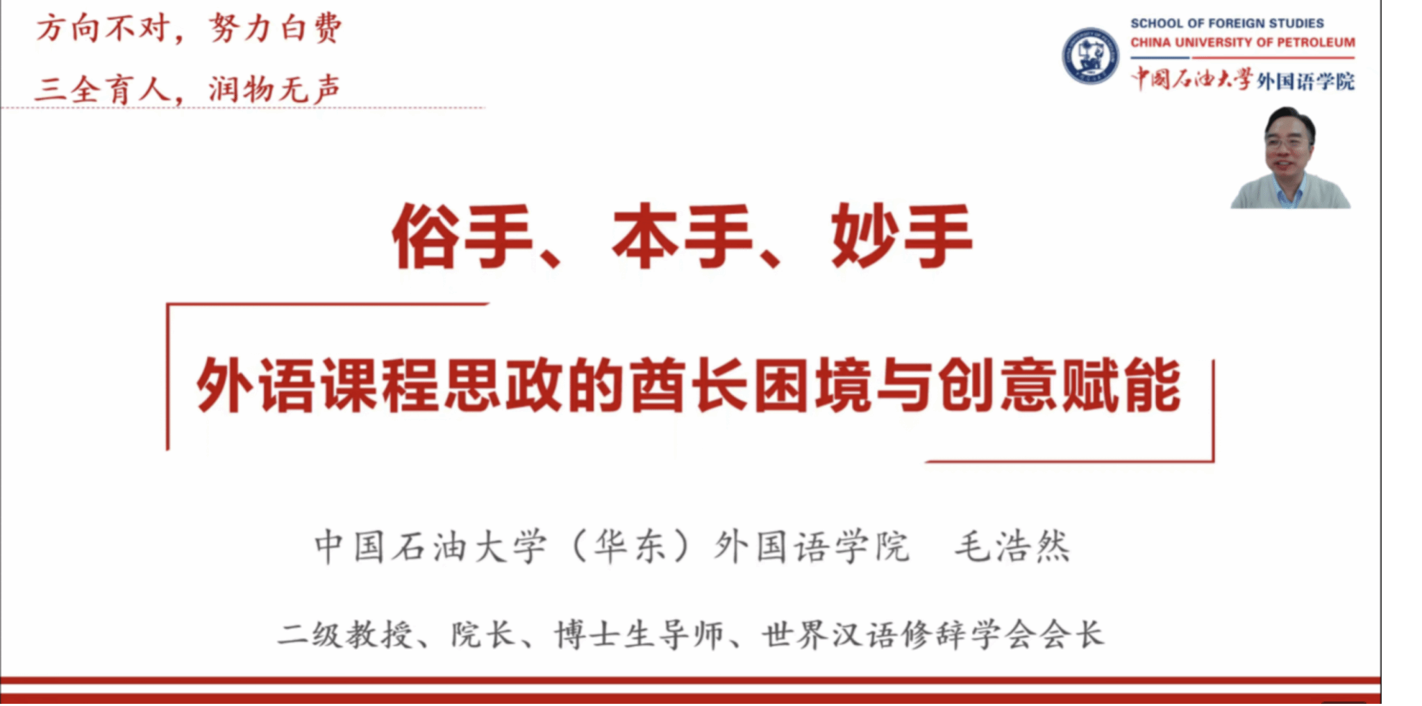 2023年11月21日晚上,中国石油大学(华东)Beat365中文官方网站院长毛浩然教授为Beat365官网师生带来“俗手、本手、妙手:外语课程思政的酋长困境与创意赋能”的线上讲座。本次讲座由Beat365中文官方网站教师教学发展中心、外语课程思政研究中心联合举办,是“外语与外语教学”系列讲座之一,由教师教学发展中心主任马拯副教授主持,来自Beat365中文官方网站和校内外共100多名教师和研究生参加了本次讲座。