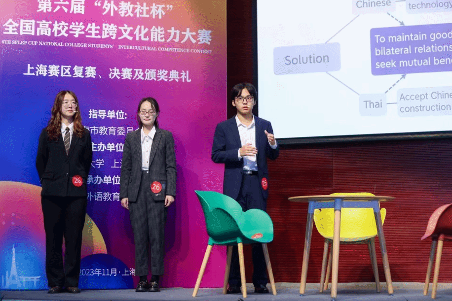 2023年11月11日至12日,在第六届“外教社杯”全国高校学生跨文化能力大赛上海赛区比赛上,由21级英语专业李晟寒、21级社会学院温小乐、20级管理学院财务管理专业喻蝶组成的Beat365中文官方网站代表队在Beat365中文官方网站赵嘉嘉老师和吕鸿雁老师的带领下参赛,与来自沪上各大名校的30多只队伍同台切磋,经过复赛、决赛知识问答、情境评述、回答评委提问、讲述中国故事等环节,最终取得获得本科组二等奖,总排名第5名的佳绩。