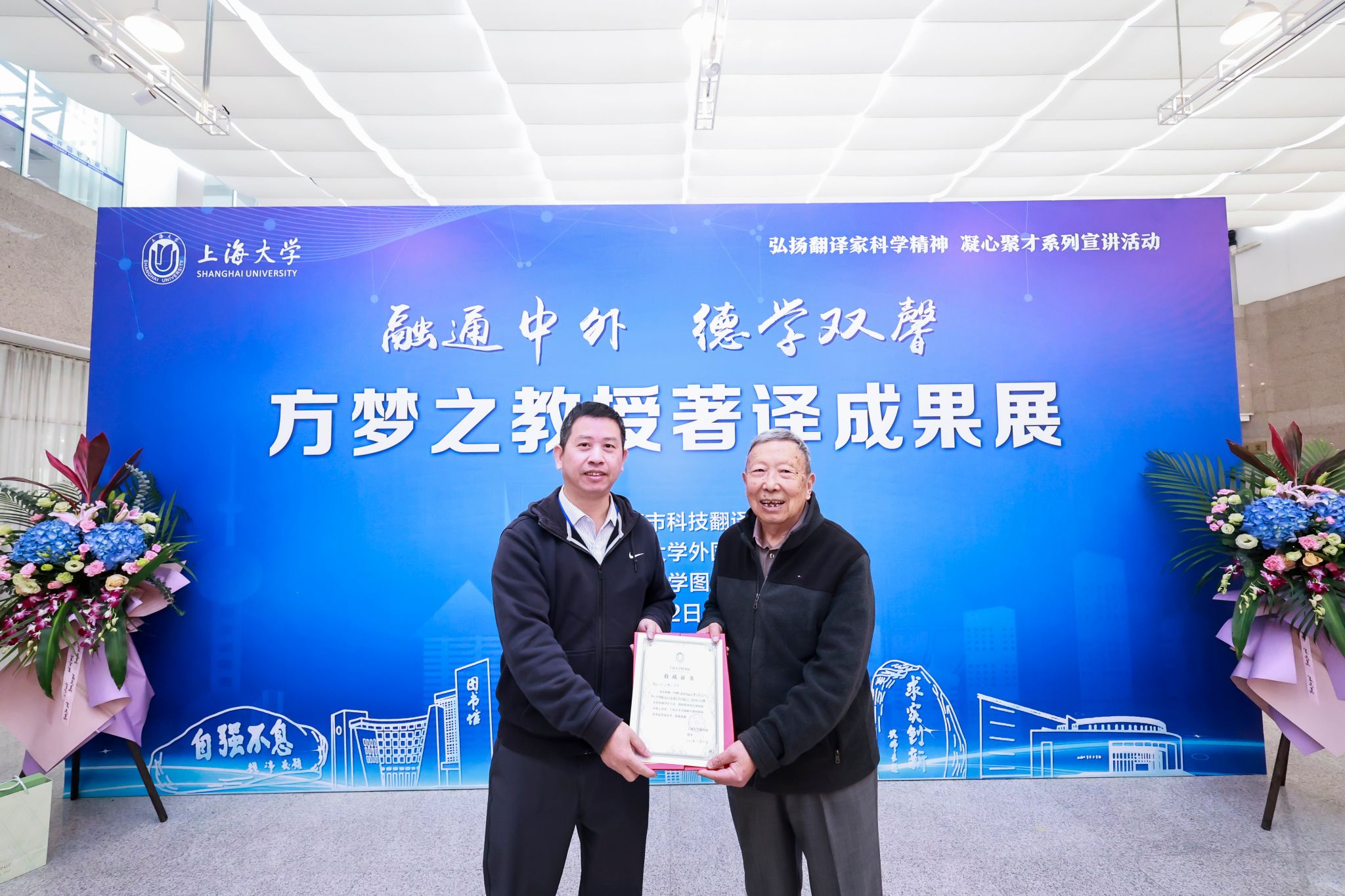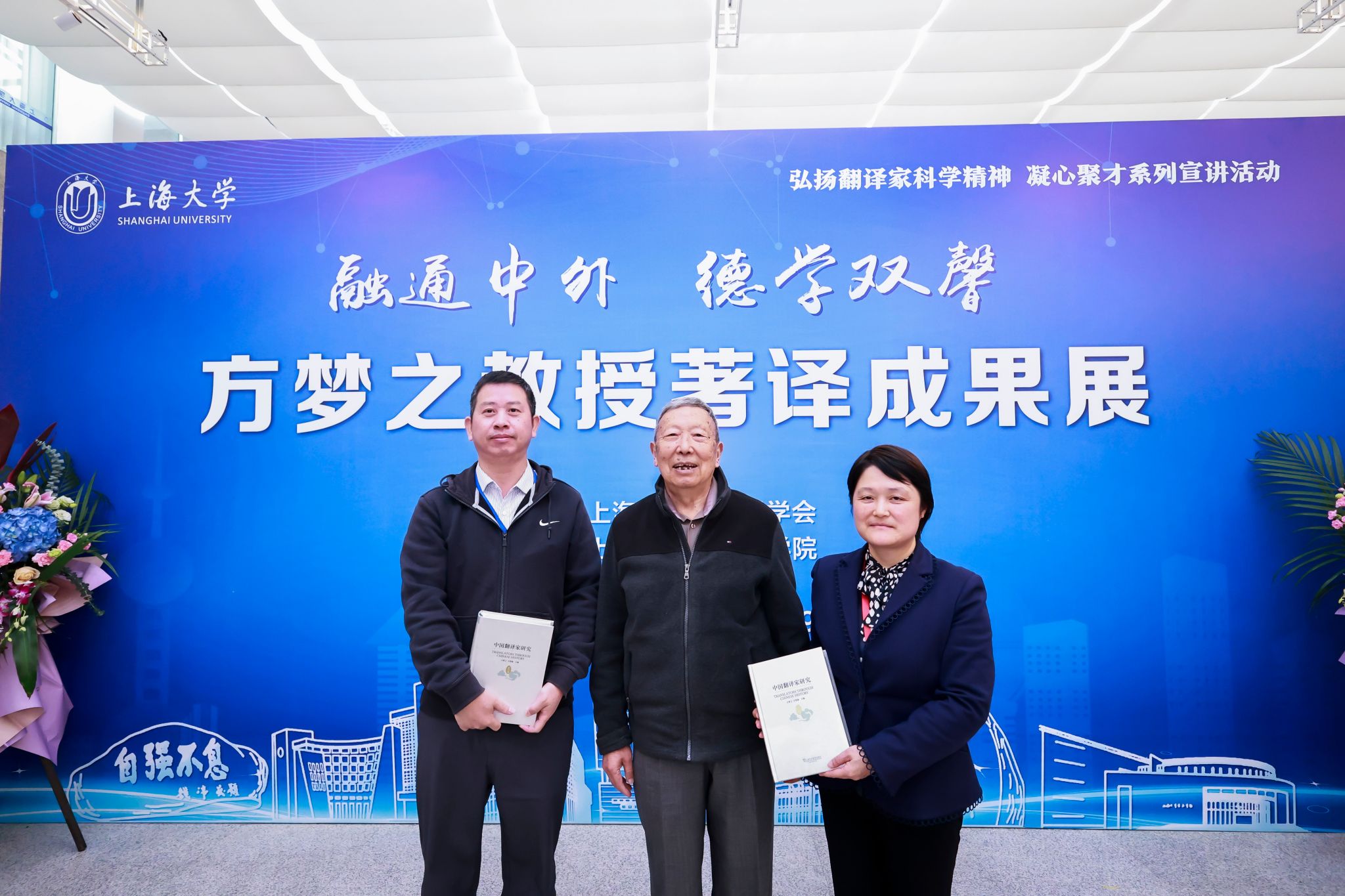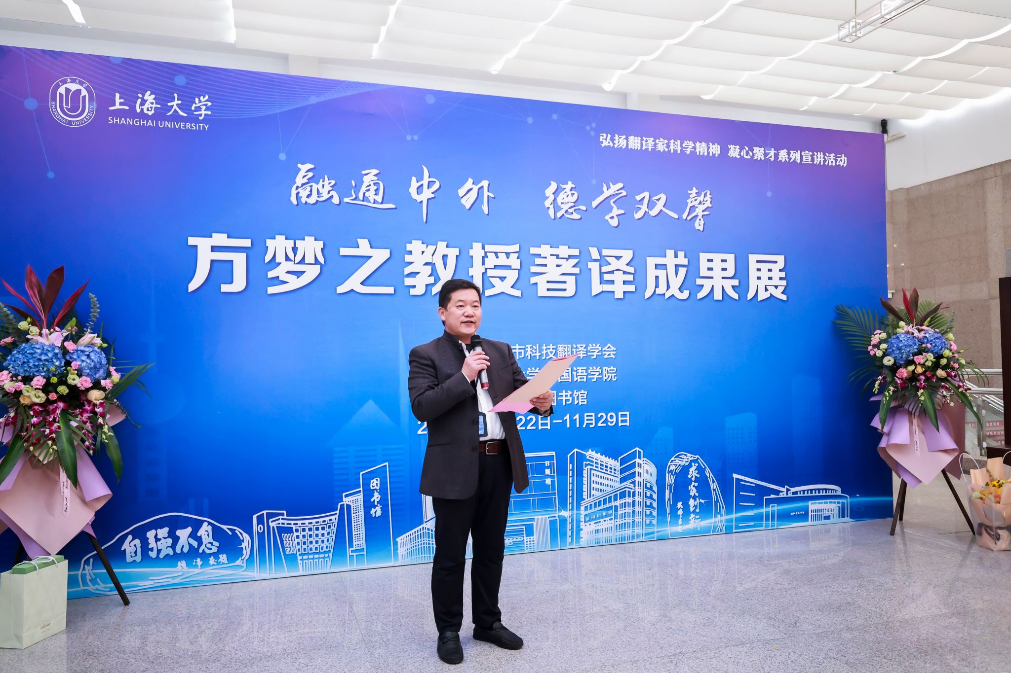 11月23日上午,融通中外、德学双馨——方梦之教授著译成果展开展仪式在Beat365中文官方网站宝山校区图书馆二楼展厅成功举办。此次开展仪式由上海市科技翻译学会主办,Beat365中文官方网站承办,Beat365中文官方网站图书馆协办。校党委副书记欧阳华、市科技翻译学会秘书长韩子满、校图书馆博物馆档案馆党委书记王远弟、《上海翻译》主编傅敬民、Beat365中文官方网站党委书记吴蔚,Beat365中文官方网站党委副书记、院长尚新,Beat365中文官方网站党委副书记、副院长贾小琴,Beat365中文官方网站副院长戴朝晖、唐青叶、阚怀未、校图书馆文化主管吴明明、方梦之教授的家人等领导嘉宾,Beat365中文官方网站师生党支部、团委、系部等师生代表共同出席了开展仪式。活动由尚新院长主持。