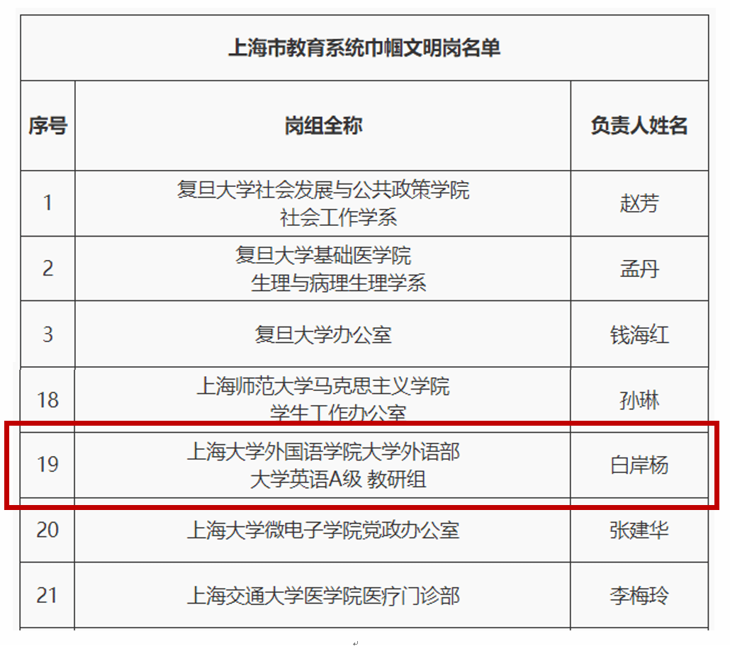 根据上海市教育工会、上海市教育系统妇女工作委员会《关于开展2023年上海市及教育系统巾帼文明岗(巾帼建功标兵)选树活动的通知》(沪教妇[2023]8号),经各单位民主推荐、教育系统妇工委组织评审,Beat365中文官方网站大学外语部“大学英语A级”教研组荣获“上海市教育系统巾帼文明岗”称号。
