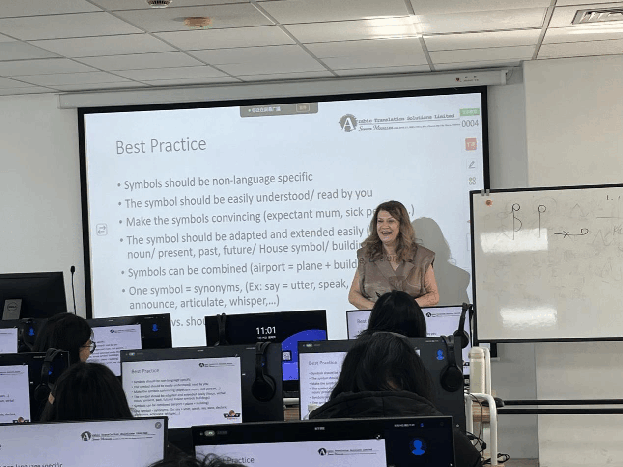 Mouallem教授长期致力于国际会议口译和公共服务口译的研究与实践,是同声传译和交替传译方面的专家。在授课中,教授反复强调,作为一名合格的口译员不仅需要具备良好的源语与译入语的语言文化知识,对会议发言人言语的分析能力、出色的记忆力、高效处理笔记的能力亦不可或缺。Mouallem教授结合自身为联合国、七国集团峰会、英国王室与阿拉伯王室会谈担任译员的丰富实战经验,为同学们详细地介绍了交替传译中译员可能会遇到的种种困难及其相应的解决方案。比如在遇到方言时该如何准确翻译其含义、当说话者语速过快时如何通过合理的笔记捕捉信息、遇到信息记忆模糊时如何最大程度补全信息、在进行口译工作前如何积累可能涉及到的专业术语等口译实践中的常见情形,并强调“Thought-shower”的重要性,指导同学们从宏观上把握源语语言内部的逻辑关系。接着,Mouallem教授系统地讲授了口译笔记的研究历史、操作原则、符号体系等,为同学们掌握口译笔记技能奠定了基础。