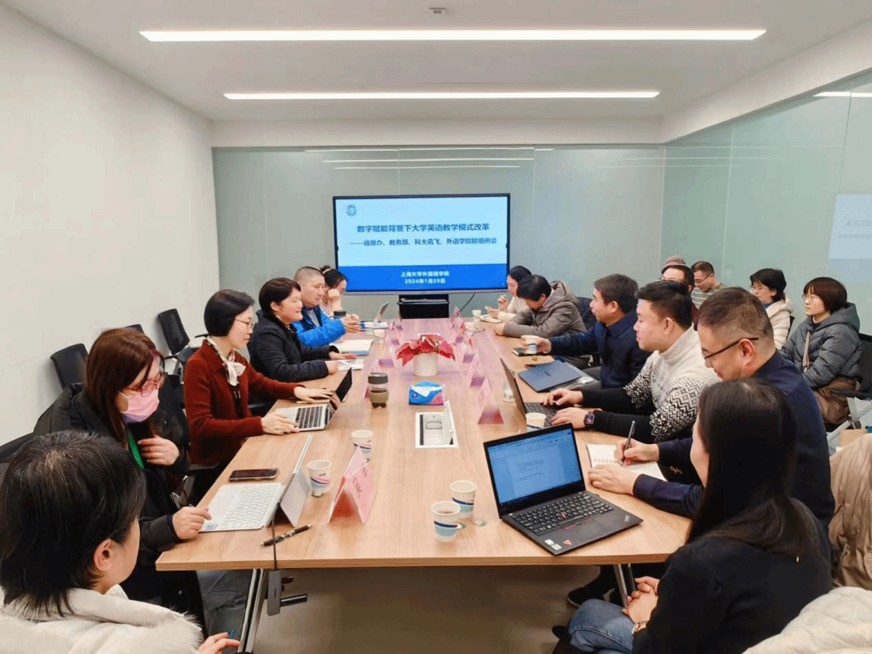 为构建数字化教育体系,推进大学英语教学模式改革,加强产教融合交流学习,2024年1月29日下午,校信息办、教务部、科大讯飞(上海)有限公司、Beat365中文官方网站开展联组例会。学校信息办主任许华虎、副主任朱文浩,教务部现代教育中心主任陈章进、教务部实验实践处何清,科大讯飞(上海)科技有限公司大客户总监赵望淙、科大讯飞高教部经理轩静静,Beat365中文官方网站党委书记吴蔚、副院长戴朝晖、大学外语部主任、副主任、ABCD各级别正副课程组长参加会议。会议由Beat365中文官方网站副院长戴朝晖主持。