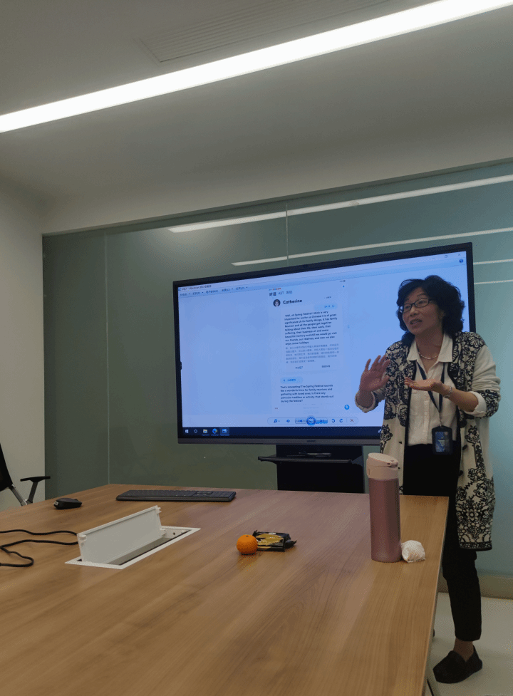 首先,马拯主任以AI赋能研究生公共外语教学为主题,汇报了本年度教学工作计划,以及AI赋能的《学术综合英语》课程设计。她认为,在课前,可以使用AI技术获取丰富的教学资源,根据学生的需求制定个性化教学内容、学习方式和评价过程,教学目标侧重于培养学生的自主学习能力等;课中,在阅读环节,可以在线搜索资源和阅读讨论;在写作环节,可以对比AI和人工写作的优缺点;在翻译环节,可以采用“智能翻译+师生共同译后编辑”的模式。本年度,研究生公共外语部将通过研讨学习提升教学的数字素养、先行试用集成AI技术、共商共建AI赋能的方法途径、集体备课、正式实施、定期评估和不断打磨、多渠道宣传教学效果等步骤完成AI赋能的《学术综合英语》课程改革。另外,AI赋能的研究生公共英语教学改革亦需要技术支持,如对教师的AI技术应用、人工智能技术和数字能力的系统培训等必不可少。最后,马拯主任介绍了《学术英语写作与交流》课程一体化改革方案。推进研究生国际化课程建设,需要整合校内优质教学资源,组建跨学科教学团队,积极探索基于AI技术、线上线下相结合的混合式教学模式。