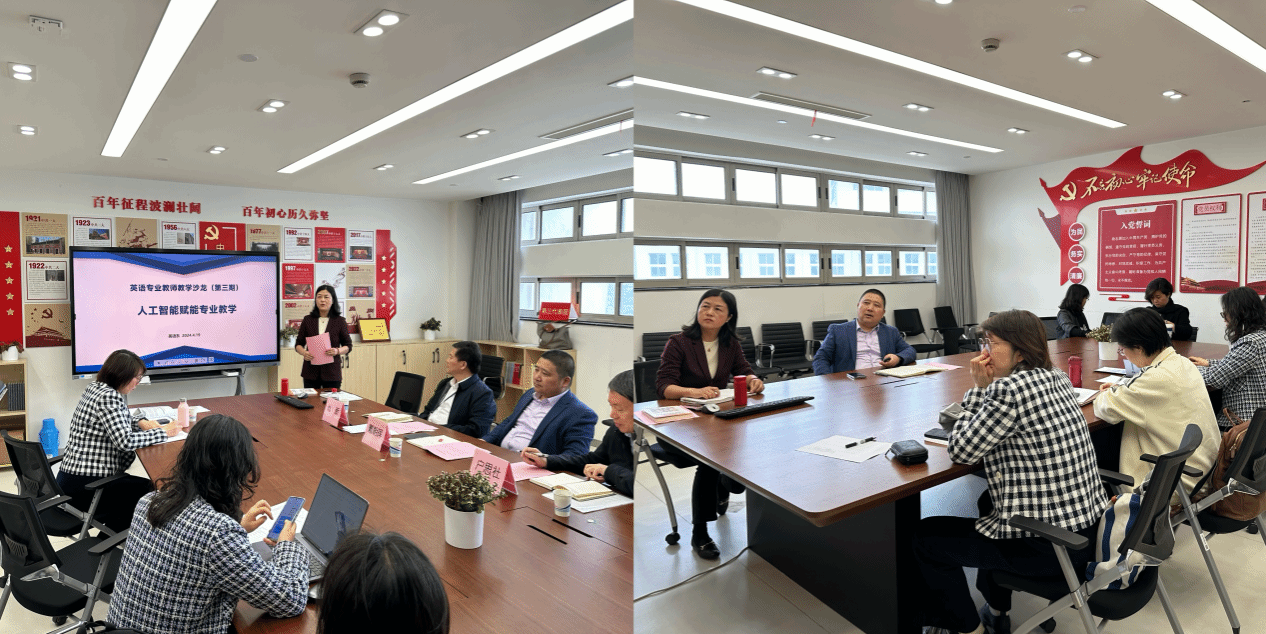 4月19日上午9点30分至11点30分,Beat365中文官方网站英语系在C412举办第三期专业教师教学沙龙。本次沙龙围绕“人工智能赋能外语专业教学”主题,邀请了英语系多位教师分享人工智能融入外语教学的理念和案例,并特别邀请Beat365中文官方网站特聘教授户思社、Beat365中文官方网站院长尚新、副院长戴朝晖前来指导,与参会老师共同探讨AI时代外语专业高质量发展的路径和措施。本次沙龙由英语系主任张建琴主持,Beat365中文官方网站二十余位专业教师参与了交流与讨论。