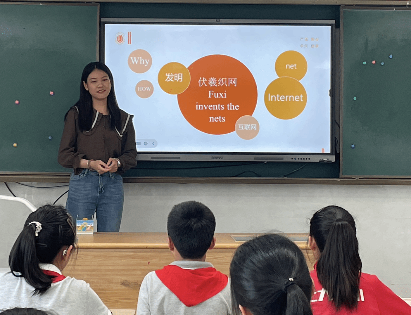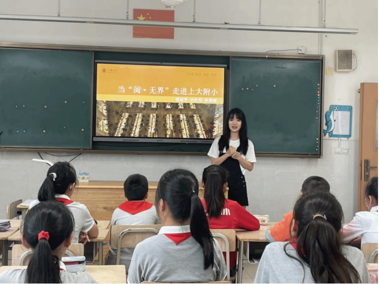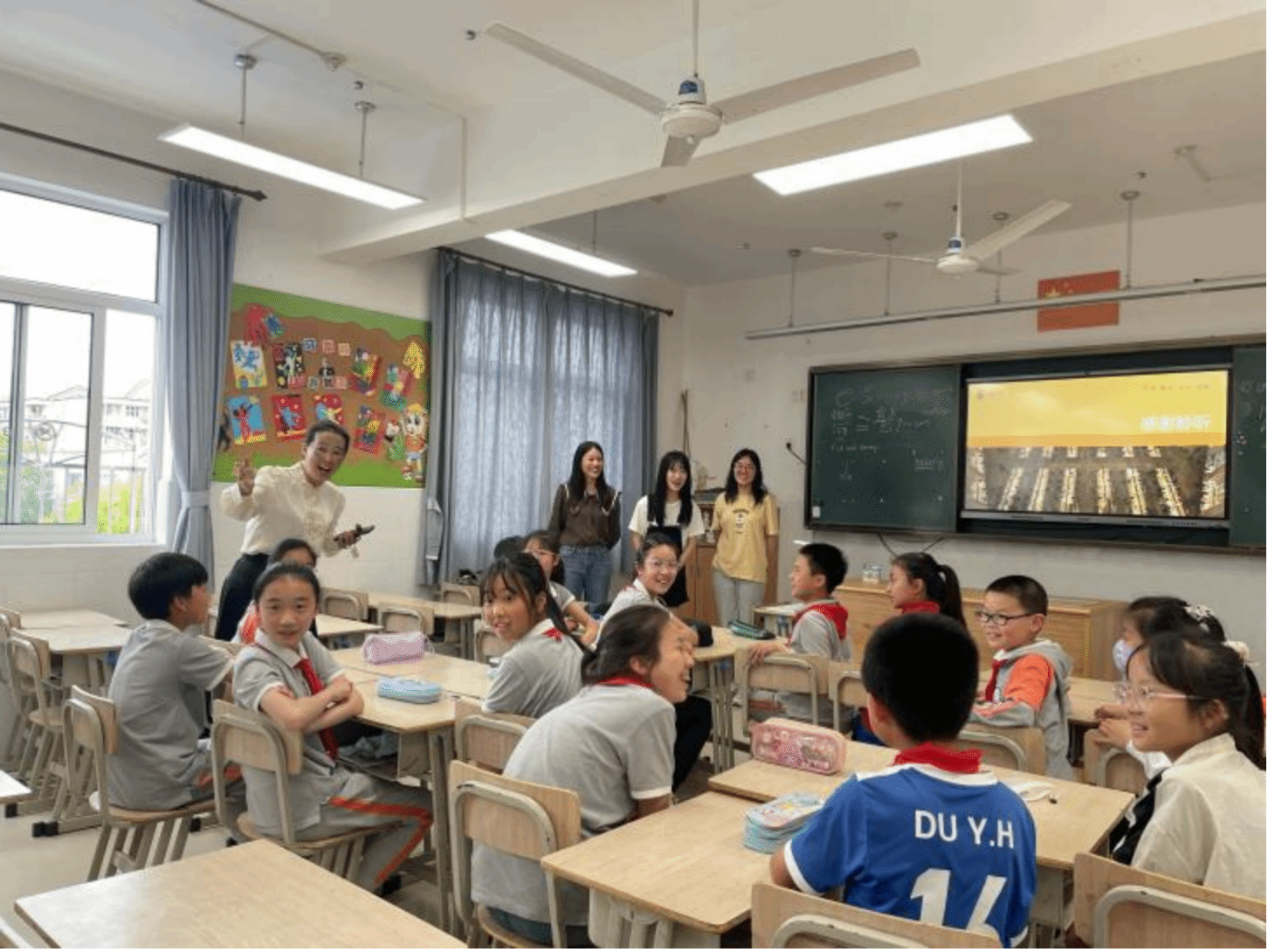 活动中,三位大学生帮助小朋友将座位布置成四组。由陈旖旎同学针对“阅·无界”项目进行简单介绍;孙欣悦同学展开故事分享,选取的是中国神话故事“伏羲织网”,让孩子在了解中国故事的同时能够积累英文表达、提升英文表达能力;强丽雯同学聚焦人与自然和谐共处的主题组织小朋友分组进行讨论。三位小老师分别加入不同小组的讨论,引导学生尝试表达自己的看法。课程深受孩子们喜欢,现场氛围活跃热烈,孩子们纷纷表示自己从课程中收获了很多。