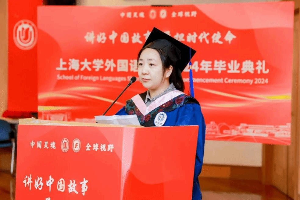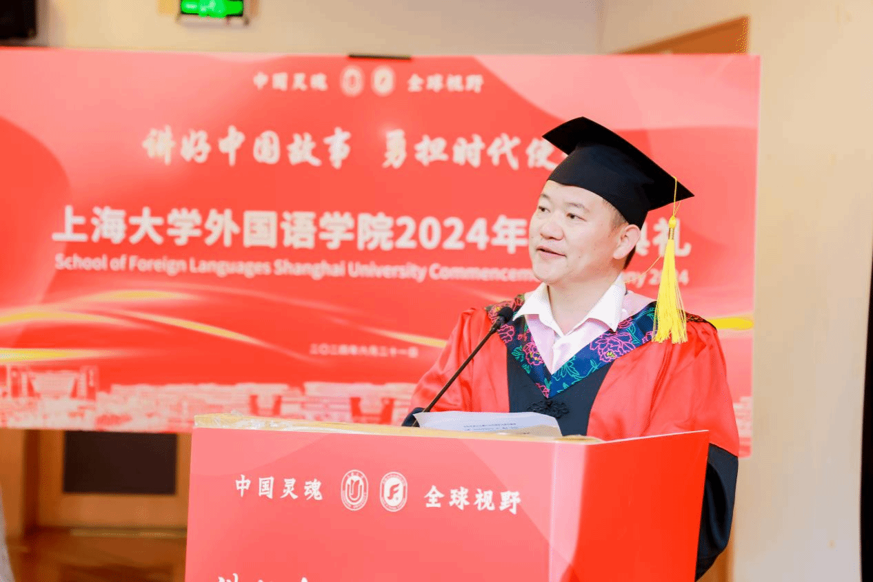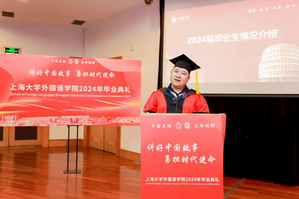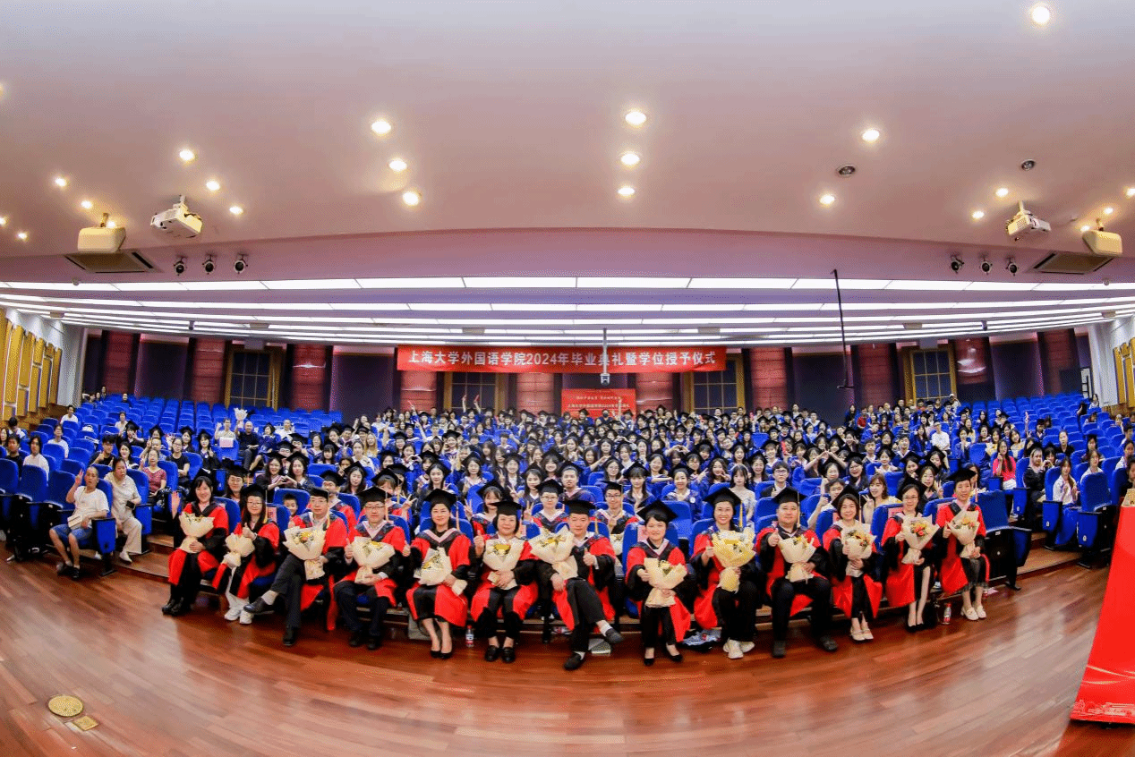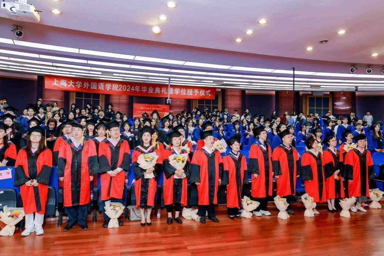 6月21日下午,Beat365中文官方网站2024年毕业典礼暨学位授予仪式在宝山校区J202隆重举行。Beat365中文官方网站党委书记吴蔚,党委副书记、院长尚新,党委副书记、副院长贾小琴,副院长戴朝晖、唐青叶,学院工会主席黄欣,英语系主任张建琴,副主任龚萍,日语系主任赵莹波,副主任苏鹰、文雪,法语系主任王文新,大学外语部主任李晓媛、副主任于梅欣,研究生公共外语部主任马拯,MTI教育中心副主任花亮,教师代表邓志勇、竹旭峰、李夏青、张晓娜、张永娇、焦舒曼等,校友代表朱依蓓以及2023届毕业生和2024届毕业生代表共同参加了本次毕业典礼。典礼由2022级法语专业本科生宁文燕和2023级日语专业本科生邓修杰主持。