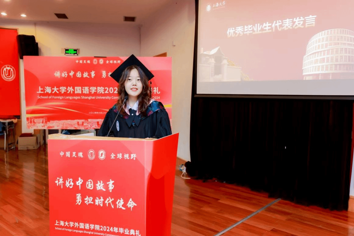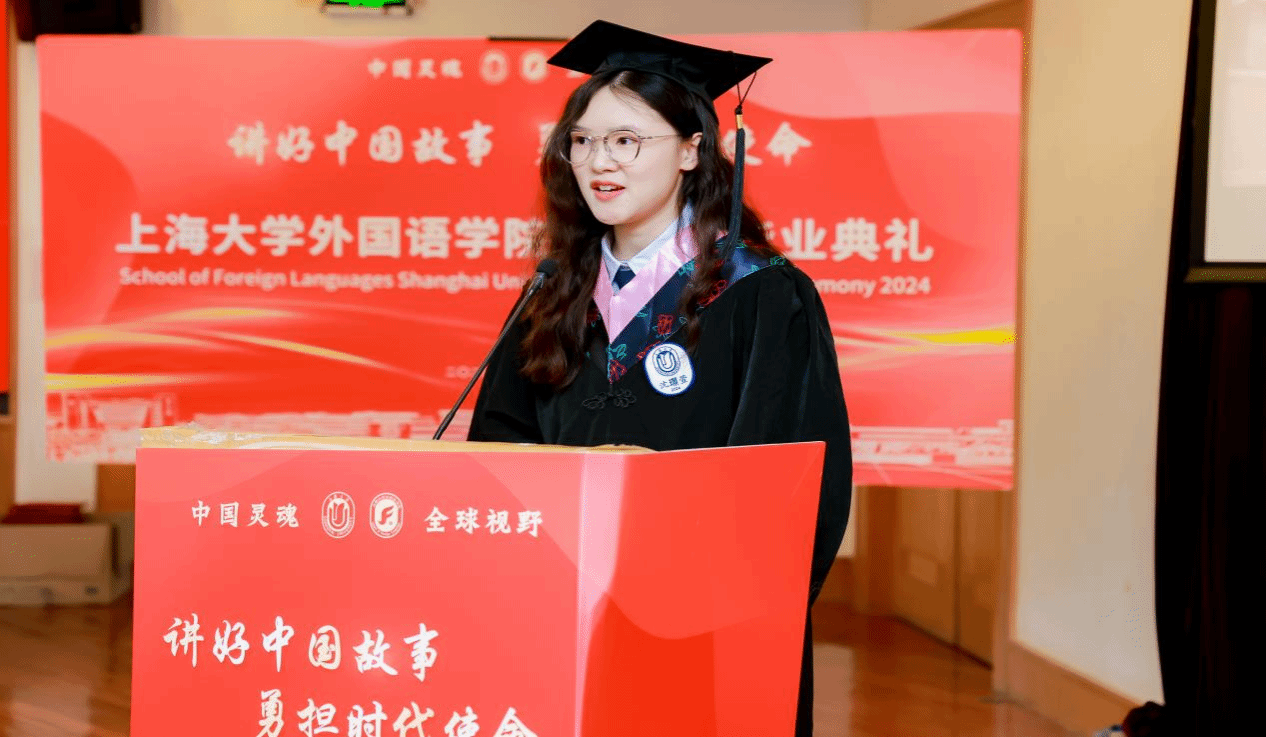 上海市优秀毕业生沈璟萱同学提及大学四年丰富多彩的校园生活,尤其是作为2024年度大戏导演的过程中感受到中外文明互鉴的魅力,表示身为外院学子们今后会继续努力做好中国故事的讲述者。