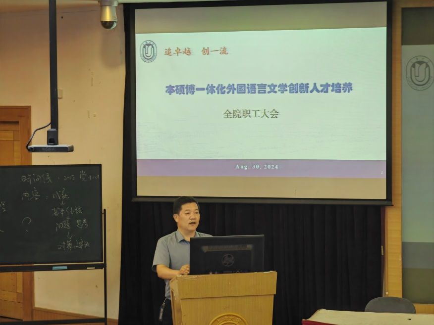 最后,党委副书记、院长尚新以“本硕博一体化外国语言文学创新人才培养”为题进行了汇报。尚院长强调今年是学院事业发展具有跨越性的一年,在此背景下,需要提升人才培养的规格,布局本硕博一体化外国语言文学学科体系;在转型发展中,要注重专业内涵要素六位一体,通专结合,以及本硕博一体化、贯通式培养。同时,尚院长也强调了学院治理能力要同步提升,以领军人才引育、重大重点项目、拓展国际合作、创收增收支撑、强化制度执行等保障能力为创新人才的培养保驾护航。