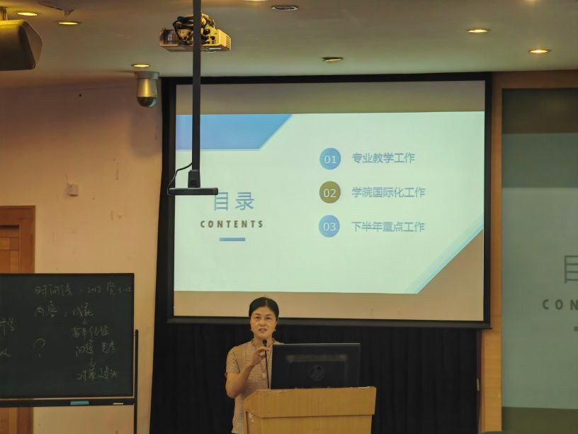 副院长张建琴主要介绍了暑期和开学的相关分管工作情况以及下半年工作重点。在专业教学方面,主要是转专业、迎新和全程导师工作;在国际化工作方面主要是探索硕士3+1项目和落实外教到岗以及外专项目的申报。下半年重点工作主要有课程建设与教改项目申报、加快推进一流专业建设、微专业招生筹备、AI赋能课程教学成效评估及海外合作工作推进落地等五项工作。
