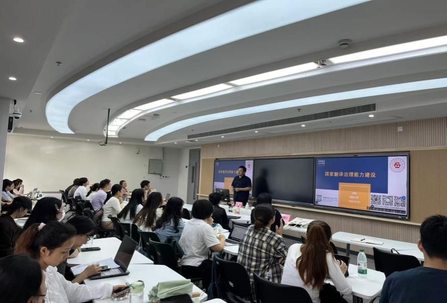 沈骑教授首先指出,国家翻译规划由决策咨询、社会服务、资源转化和学科创新四个重要模块组成。随后,他以语言规划为引子,通过秦始皇“书同文”以及新中国成立后简化汉字、推广普通话等语言政策为例,在生动风趣的讲授中使在座师生对语言规划的基本定义、内容和研究现状有了初步了解。