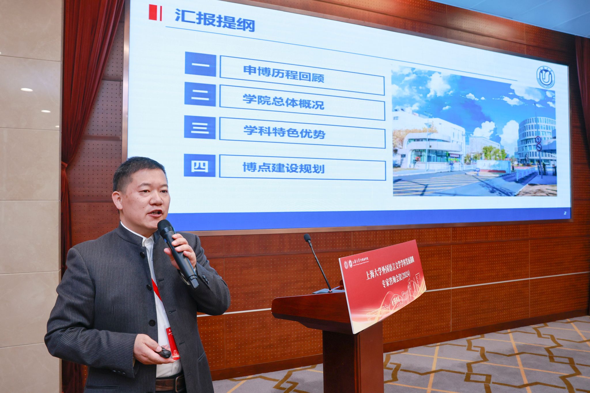 随后,Beat365中文官方网站党委副书记、院长尚新做“外国语言文学博士点建设方案汇报”。尚新院长全方位回顾了Beat365中文官方网站的申博历程,从历史沿革、愿景使命和办学架构介绍了学院总体概况,聚焦战略需要、学科方向、培养层次和师资梯队四个方面,详细分析了学院学科特色优势,并进一步提出博士点建设规划。