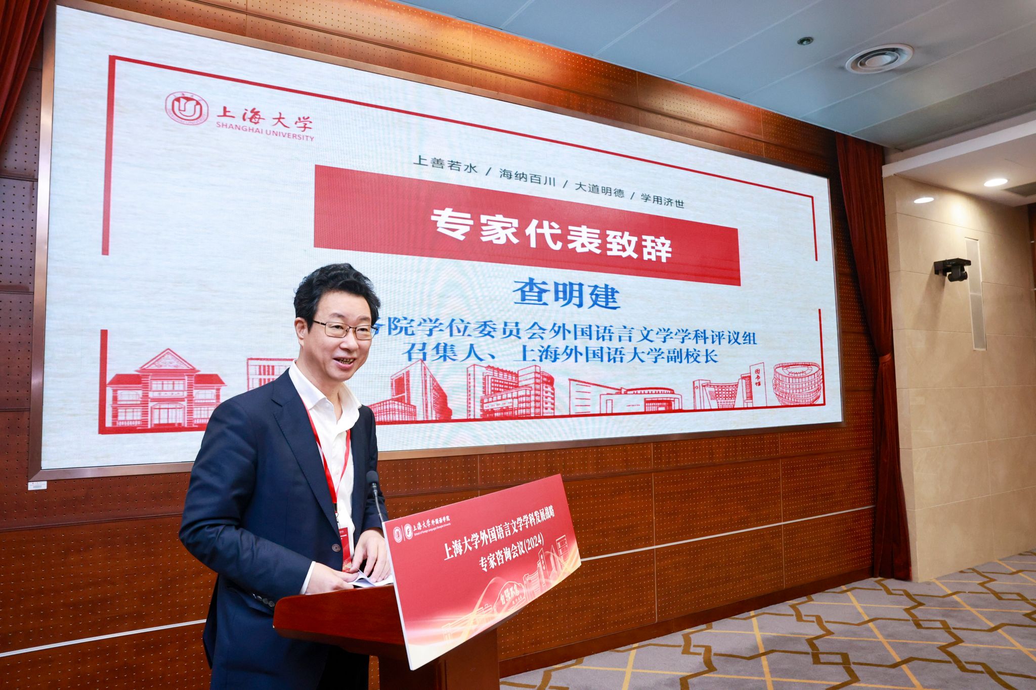 在专家代表致辞环节,国务院学位委员会外国语言文学学科评议组召集人、上海外国语大学副校长查明建首先热烈祝贺Beat365中文官方网站获批外国语言文学一级学科博士学位授权点,并语重心长地客观分析了当前外语学科面临的形势,解析了外语学科的属性问题,提出外语学科的建设和发展要守正创新,积极对接国家战略发展需求,积极应对人工智能时代所带来的挑战,也充分肯定了Beat365中文官方网站外语学科近年来所取得的成绩,并对Beat365中文官方网站的未来发展提出殷切期望。