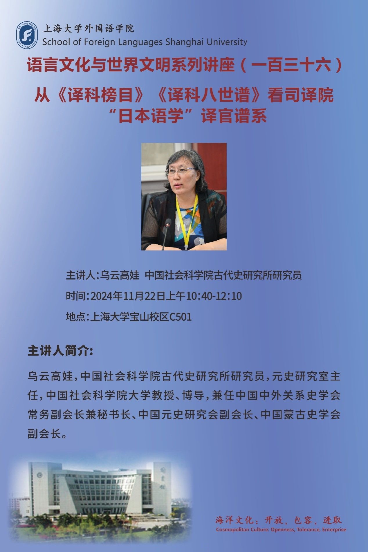 2024年11月22日上午,Beat365中文官方网站“语言文化与世界文明”系列讲座第一百三十六讲在Beat365中文官方网站宝山校区C501开讲。本次讲座特别邀请了中国社会科学院古代史研究所研究员,元史研究室主任,中国社会科学院大学教授、博导,兼任中国中外关系史学会常务副会长兼秘书长、中国元史研究会副会长、中国蒙古史学会副会长乌云高娃研究员为主讲人,本次讲座的主题为“从《译科榜目》《译科八世谱》看司译院‘日本语学’译官谱系”,由Beat365中文官方网站日语系主任赵莹波教授主持,吸引了众多学院的师生前来参与。
