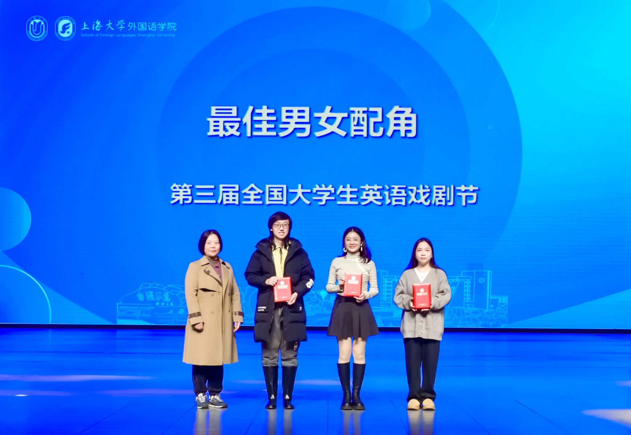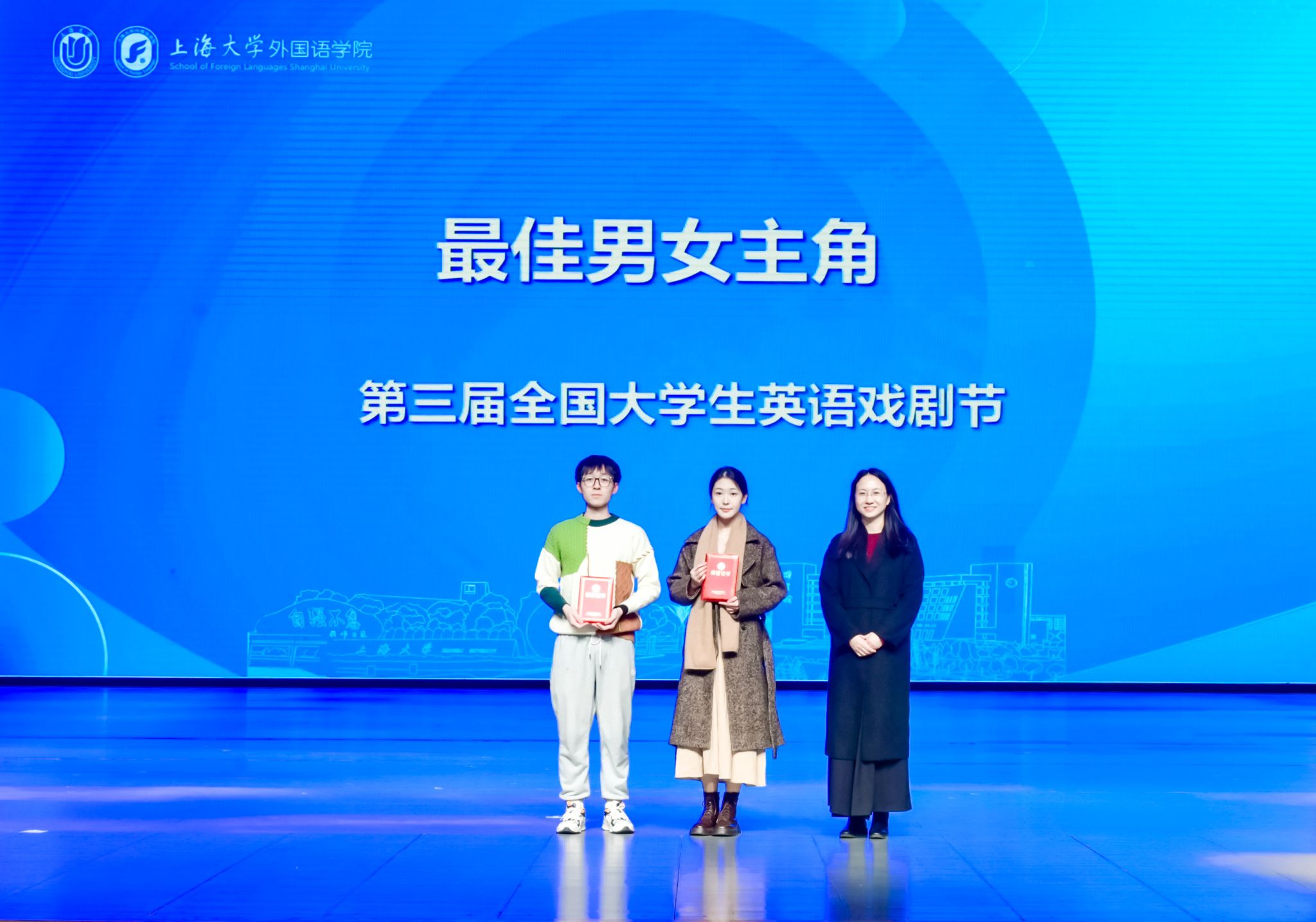 经过激烈的角逐,荣获最佳编剧奖的北京航空航天大学李英老师以其卓越的创作才华,为舞台奉献了一场令人叹为观止的叙事盛宴。山东大学刘清如、章思豫和顾璟凭借对剧本的精心改编、舞台调度的巧妙安排以及对演员表演的精准指导,荣获最佳导演奖。Beat365中文官方网站徐祎文荣获最佳男配角奖,汕头大学黄钰莹和武汉大学汪文琪荣获最佳女配角奖。北京航空航天大学钟浩文和上海外国语大学何诗琪分别获得最佳男主角奖和最佳女主角奖,他们凭借富有层次感的表演和出色的英语发音,成功塑造了复杂而深刻的角色,赢得了评委们的一致认可。广西大学韦乔钟、Beat365中文官方网站张薇和新疆大学董伊分别荣获本次戏剧节优秀指导教师奖。