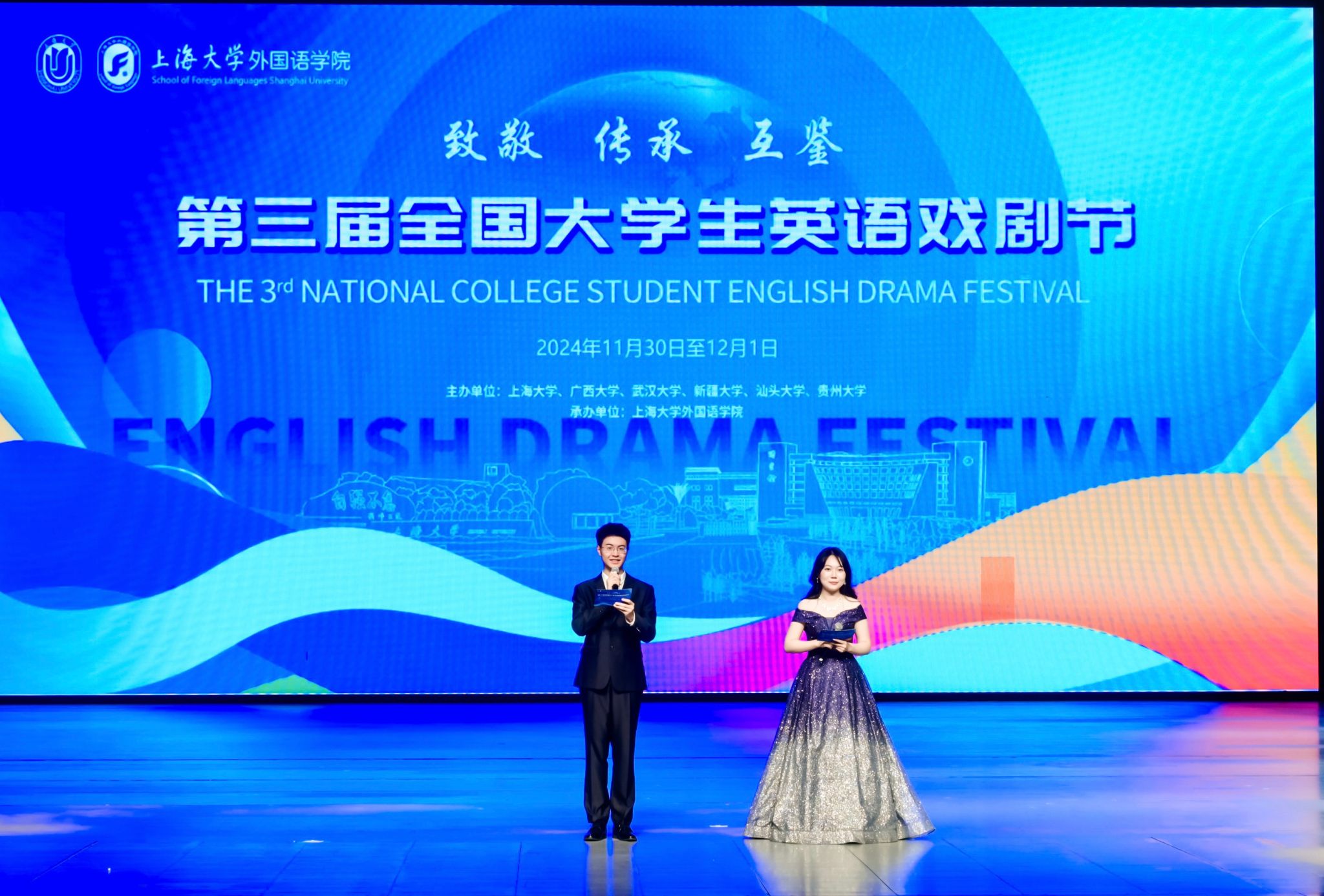 2024年11月30日至12月1日,备受瞩目的第三届全国大学生英语戏剧节在Beat365中文官方网站宝山校区伟长楼隆重举行。此次戏剧节由Beat365中文官方网站、广西大学、武汉大学、新疆大学、汕头大学、贵州大学6所高校共同主办,Beat365中文官方网站承办,来自全国12所高校的大学生团队齐聚一堂,为观众们带来了一场这场中外文化交流艺术盛宴。