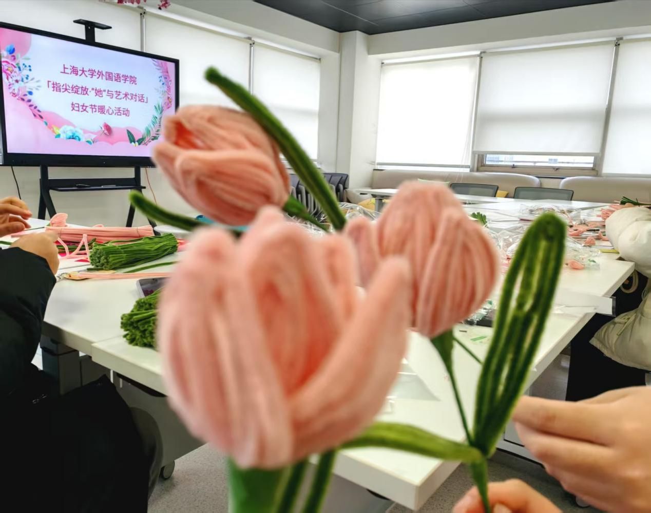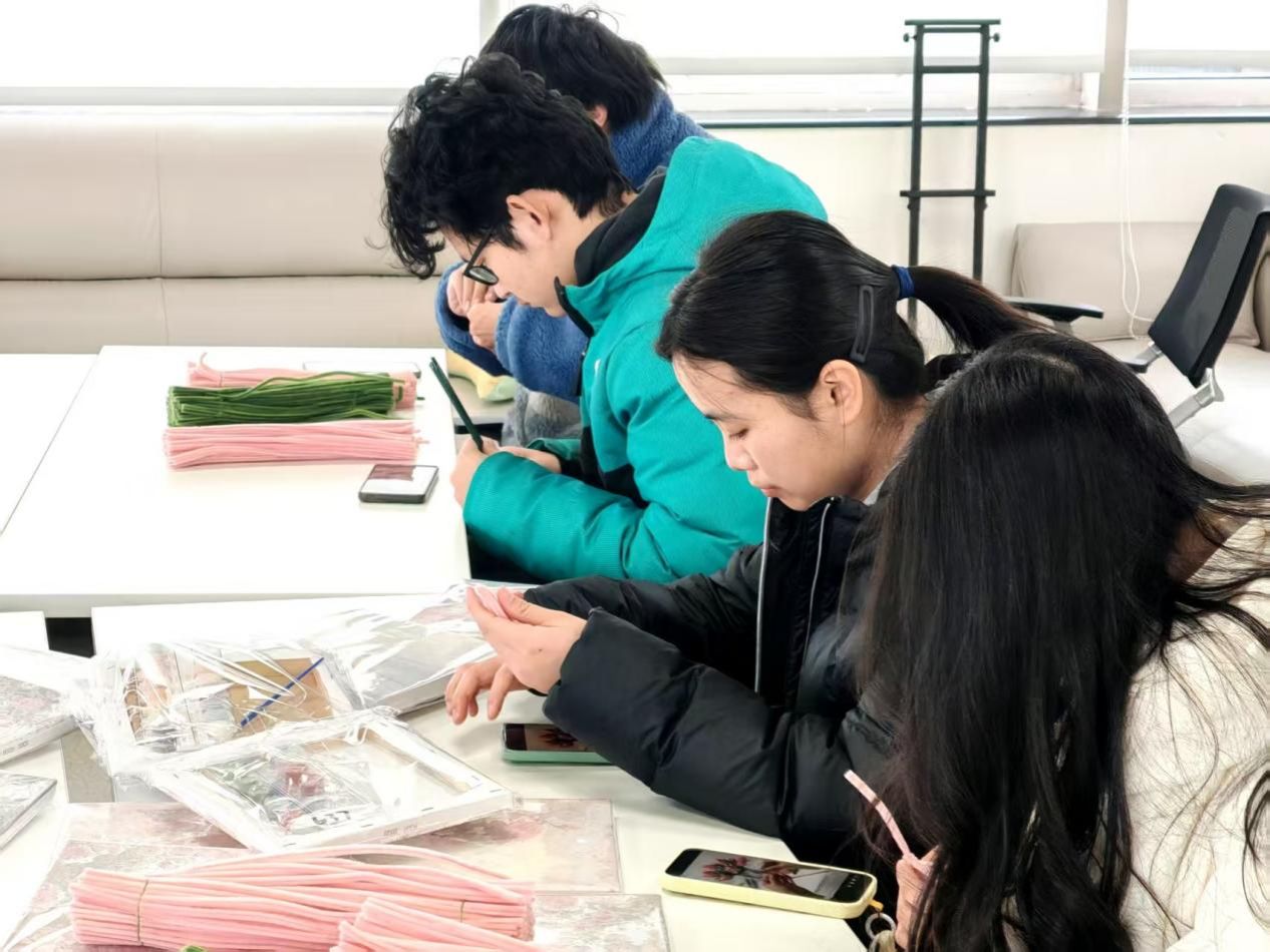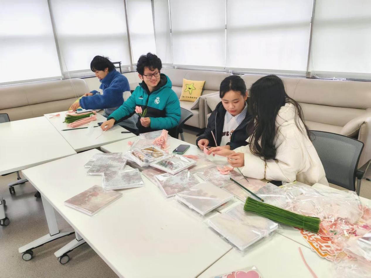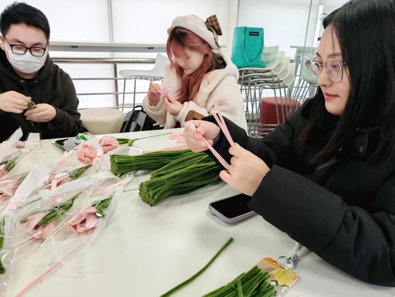 活动伊始,同学们便迫不及待地围坐在一起,全神贯注地投入到手工花制作中。他们拿起彩色的扭扭棒,手指灵活地翻转、折叠,动作娴熟又充满专注。有的同学小心翼翼地扭出花瓣的形状,眼神中满是对完美的追求;有的同学细致地将花瓣一片片组合在一起,再用细铁丝固定,手法轻柔而认真。不一会儿,一束束栩栩如生的手工花便绚丽绽放在同学们的掌心。这些粉丝绒花色彩斑斓,每一朵都饱含着同学们无尽的心意。