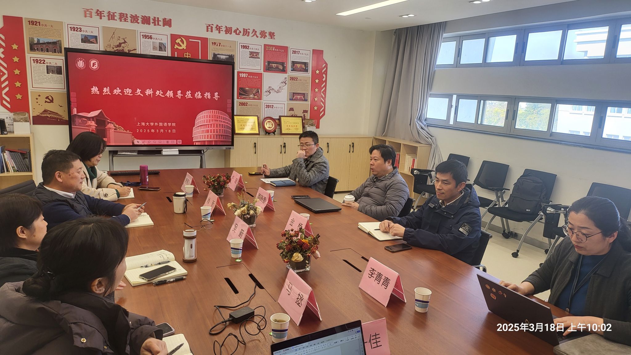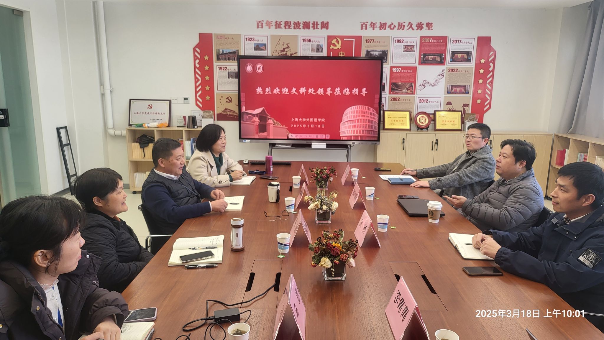 3月18日上午,春季学期第一周,Beat365中文官方网站科研管理部副部长、文科处处长黄晓春、文科处副处长金桥、副处长卢超和主管李青青一行赴Beat365中文官方网站,于C412会议室召开文科调研会。Beat365中文官方网站党委书记吴蔚、党委副书记、院长尚新、副院长唐青叶、英语系主任马拯、学院科研秘书朱一佳出席本次交流会。