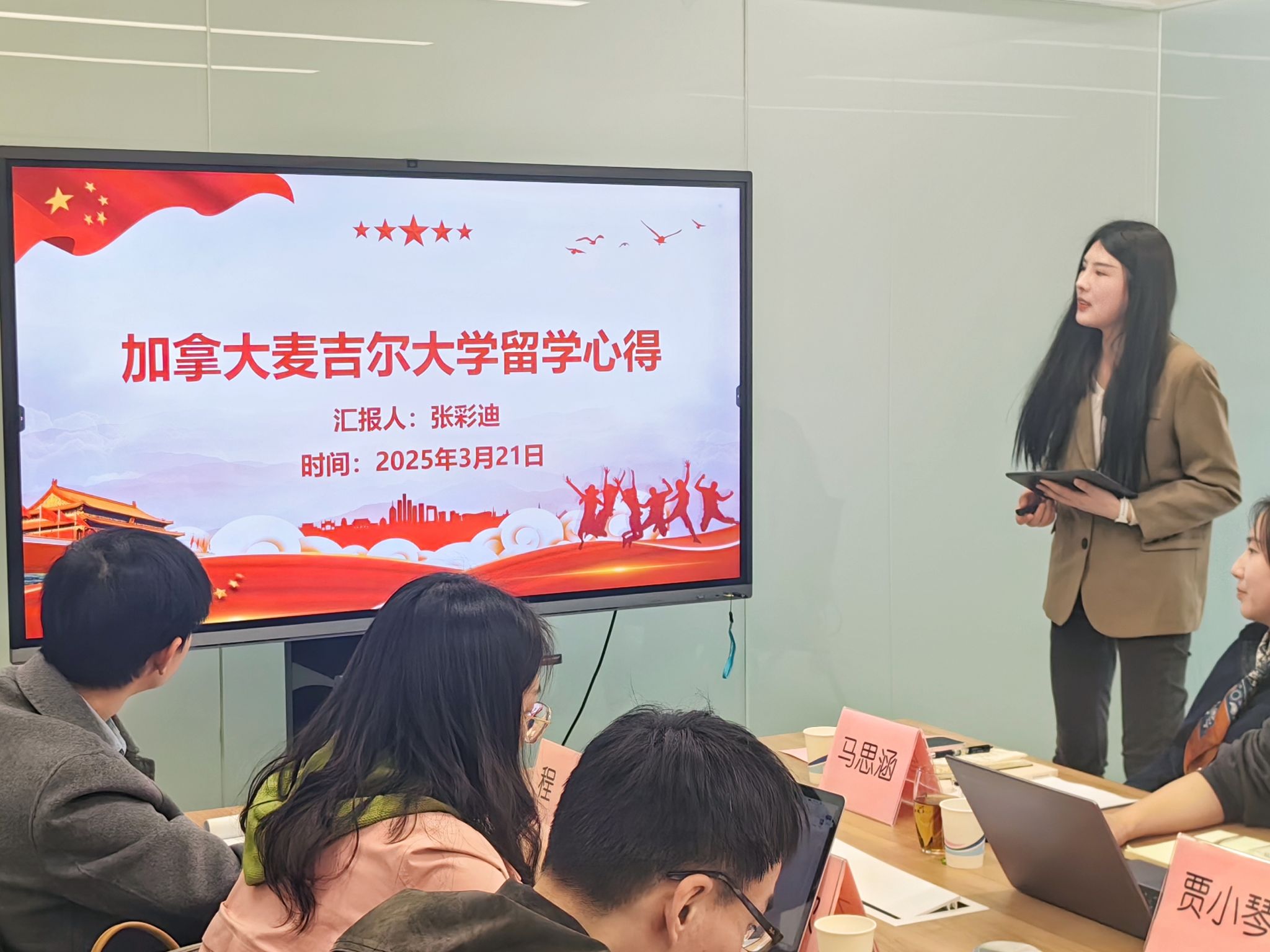 23级学术型研究生第一党支部的博士党员张彩迪以“加拿大麦吉尔大学留学心得”为题,回顾了在加拿大麦吉尔大学留学期间的学术与生活体验,分享了留学生涯的成长与挑战,并强调了海外学习对拓宽专业视野和提升国际竞争力的重要性。