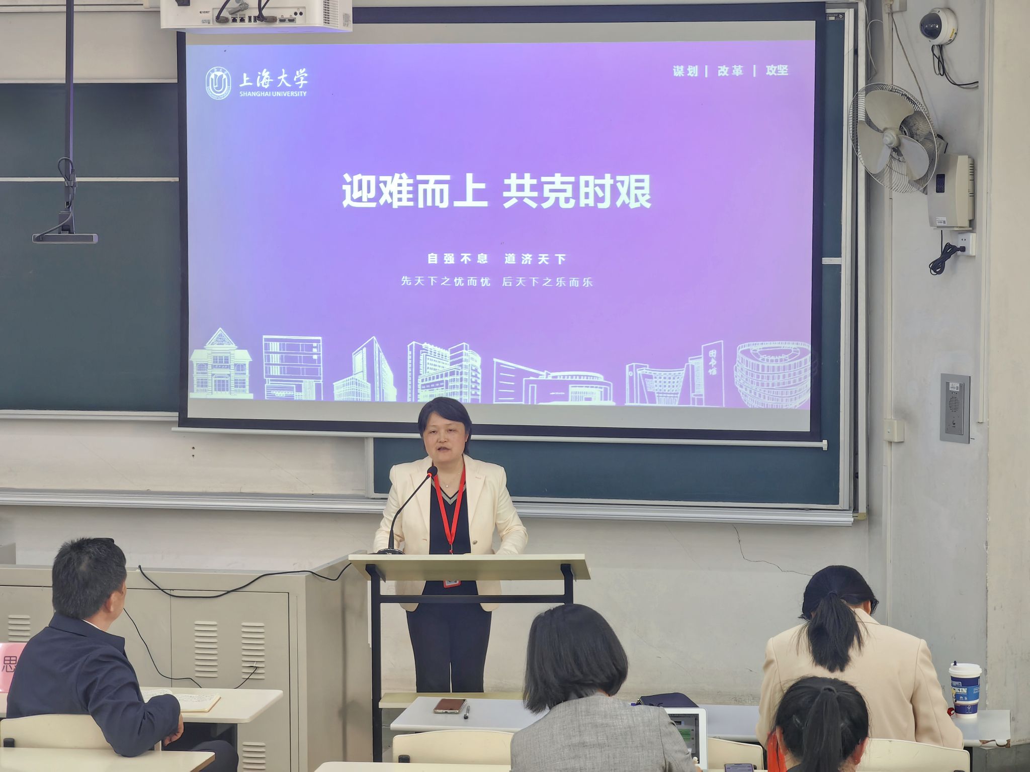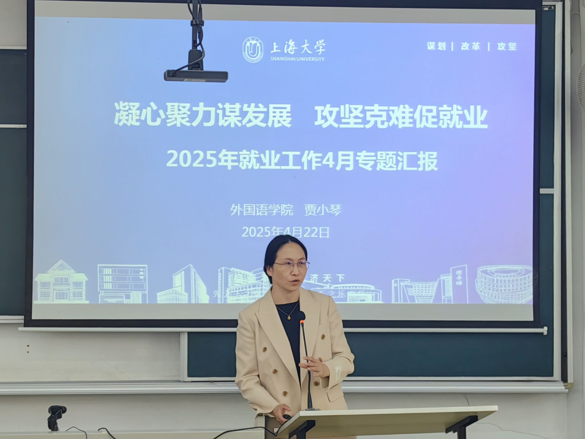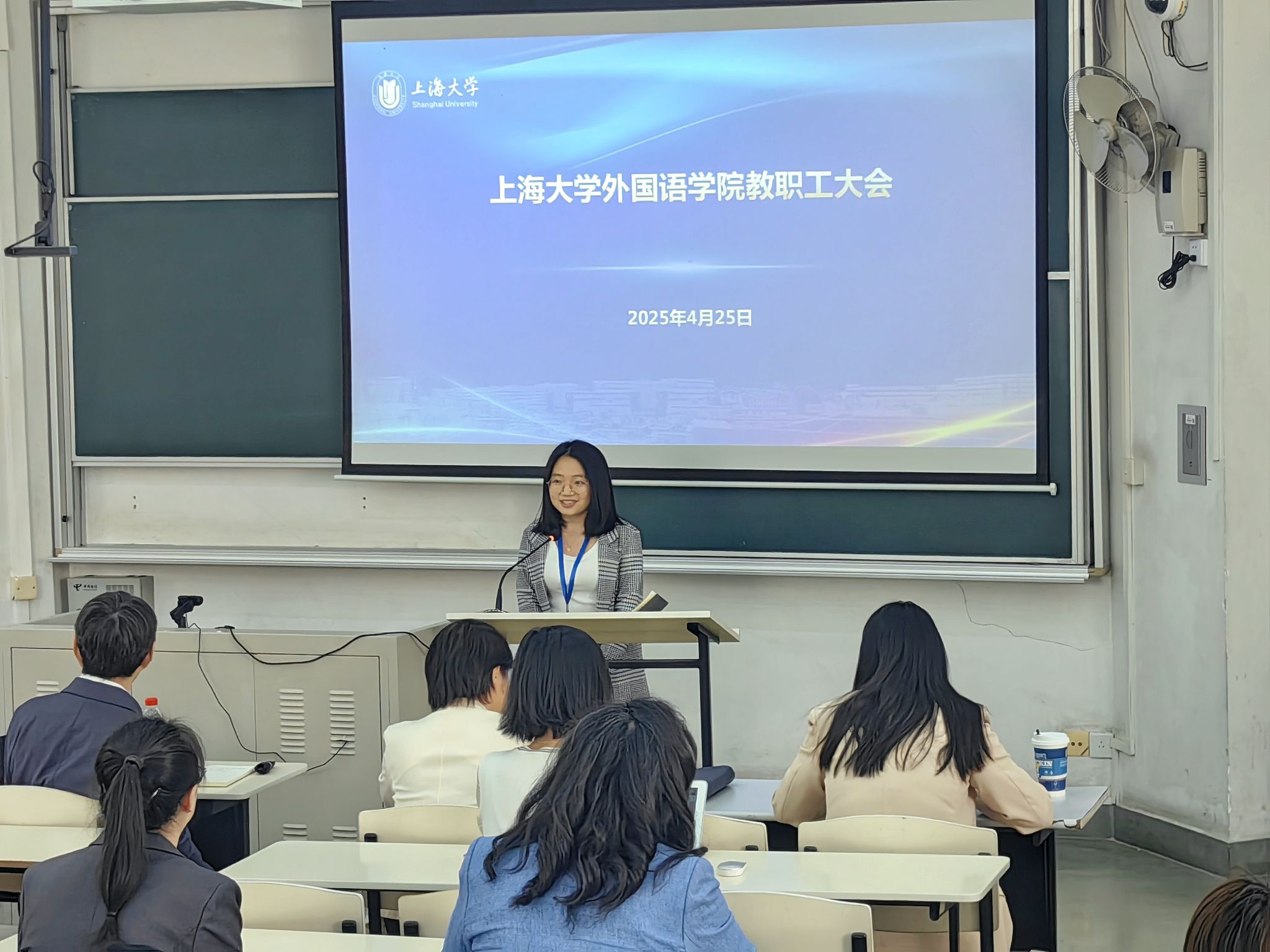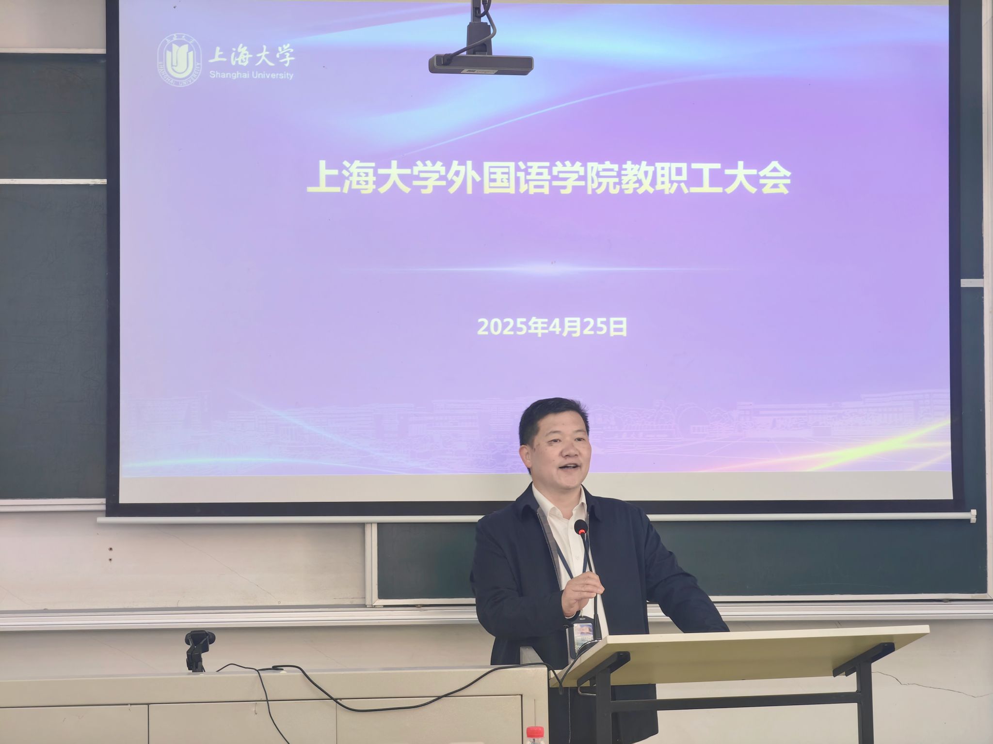 2025 年 4 月 25 日,Beat365中文官方网站教职工大会在 CJ207 教室召开。学院党政领导班子成员与全体教职工齐聚一堂,围绕人工智能时代外语专业建设新方向、就业工作新挑战等核心议题展开深入研讨,共同探寻外语专业高质量发展的创新路径。本次大会由党委副书记、院长尚新主持。