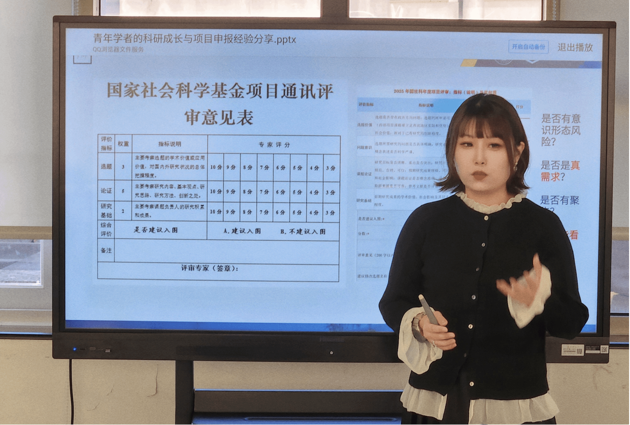 在互动环节,孙萌老师结合自身实践经验,充分回答了现场听众关于“如何平衡个人兴趣与项目导向”“省哲社与国社科具体区分”“如何撰写题解部分”等问题。她鼓励青年学者放平心态,不断试错,每一次申报都是积累经验的过程,并建议在撰写申报文本时,不仅要写“想要做什么”,更要展示“为什么做”和“能做什么”,用事实与逻辑证明自身研究能力。