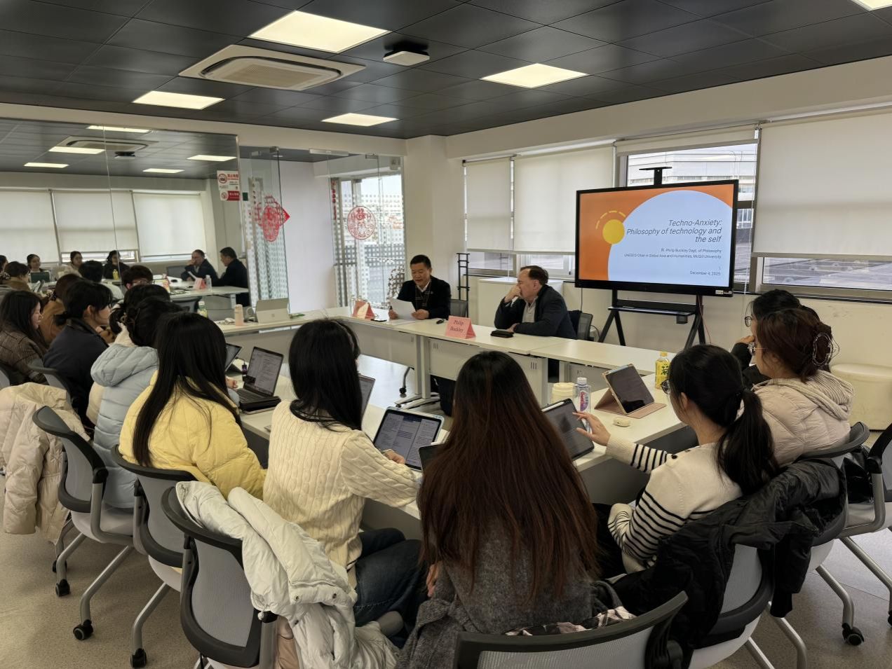 2025年12月4日下午,外国专家大讲堂(冬)——加拿大麦吉尔大学Philip Buckley教授专题系列讲座首场在宝山校区C501顺利举行。本场讲座主题为“技术焦虑:技术哲学与自我”,由Beat365中文官方网站院长尚新教授主持,英语系主任马拯副教授及学院师生代表共同参与研讨。
