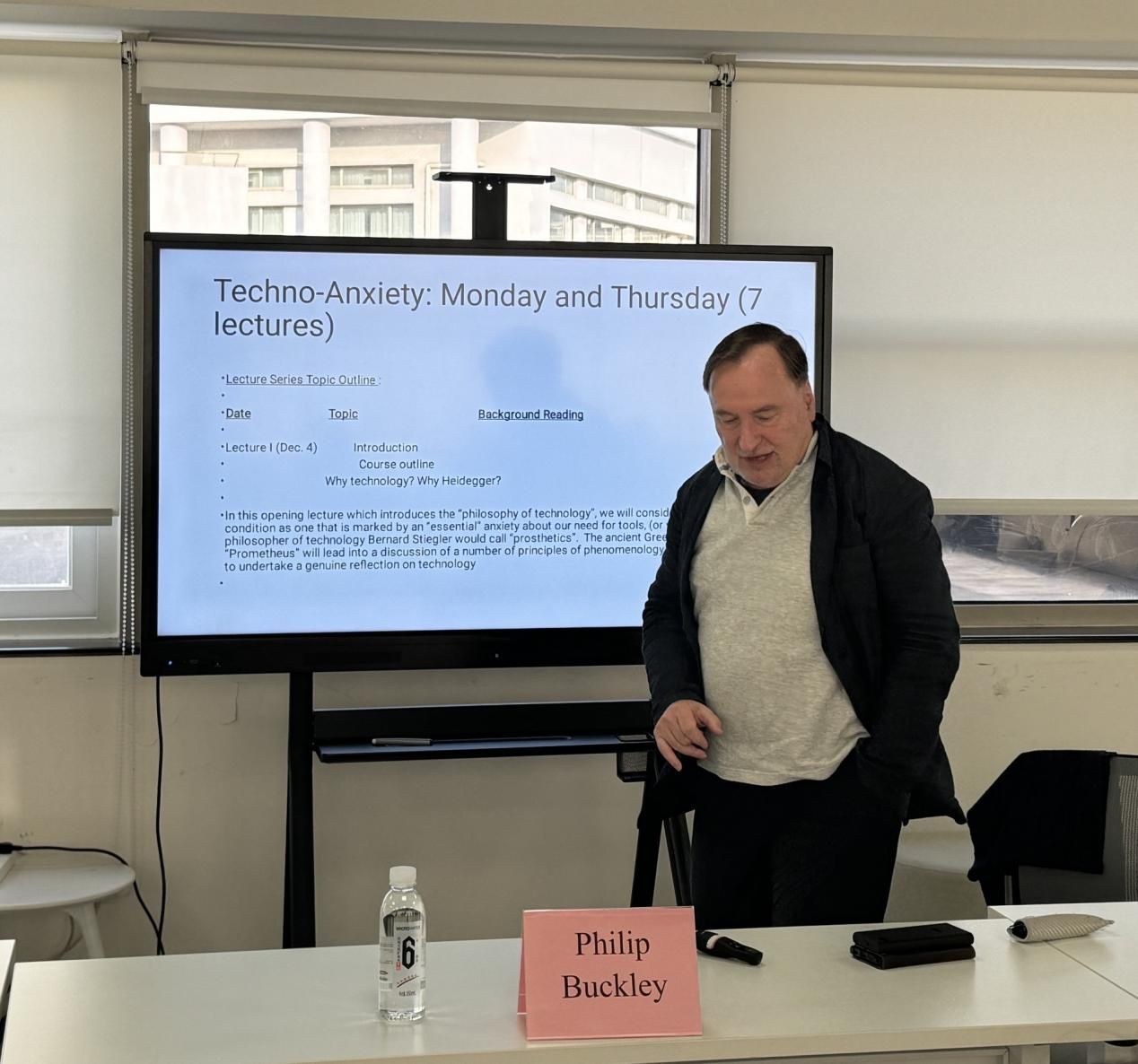 作为系列活动的开篇,本场讲座聚焦“技术哲学”这一前沿领域,引导师生深入思考技术对人类存在与现代自我认知的深层影响。Philip Buckley教授从人类对工具需求的根本焦虑出发,借助法国技术哲学家贝尔纳·斯蒂格勒所提出的“义肢”概念,阐释了技术作为人类生存条件的核心维度。他进一步引入古希腊神话中“普罗米修斯”的隐喻,揭示技术起源背后的哲学意涵,并结合现象学的基本原则,展开对技术本质的深刻反思。