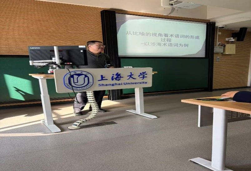 随后,他将比喻拓展到自己长期从事的涉海领域术语研究,从术语学的视角出发,他对涉海术语的词汇结构、词源背景、概念本体以及其背后所依托的喻体进行了深入分析。他详细阐释了这些术语在构建过程中所体现的明喻与隐喻思想,展示了术语背后隐含的认知模式和文化意象。张晓峰教授还构建了相关概念在认知加工过程中的思维导图,帮助听众以更直观的方式理解抽象复杂的理论框架,从而实现“把抽象概念具体化、把复杂问题简单化”的目的。