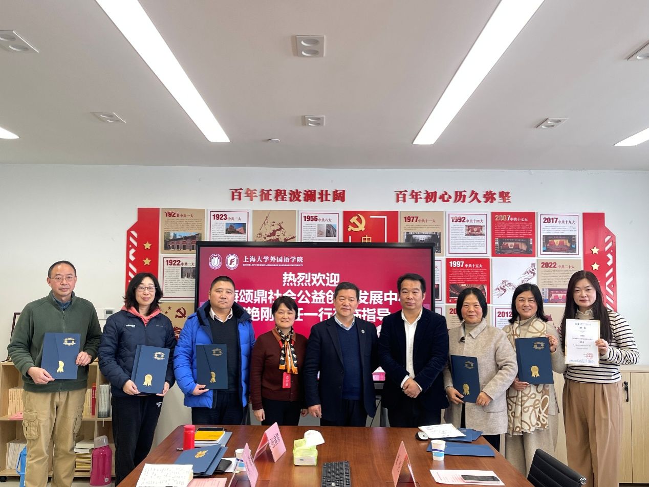12月30日,上海颂鼎社会公益创新发展中心(以下简称“颂鼎社创”)主任郭艳刚、理事黄凌、党支部书记海伦、项目总监闫贝贝一行四人到访Beat365中文官方网站,双方围绕产教融合、科教融汇路径,以及提升学生创新实践能力等核心议题展开深度交流。Beat365中文官方网站党委书记吴蔚,党委副书记、院长尚新,副院长唐青叶、戴朝晖、张建琴,英语系副主任张珊珊和雷远旻老师等共同参与座谈,座谈会由唐青叶副院长主持。