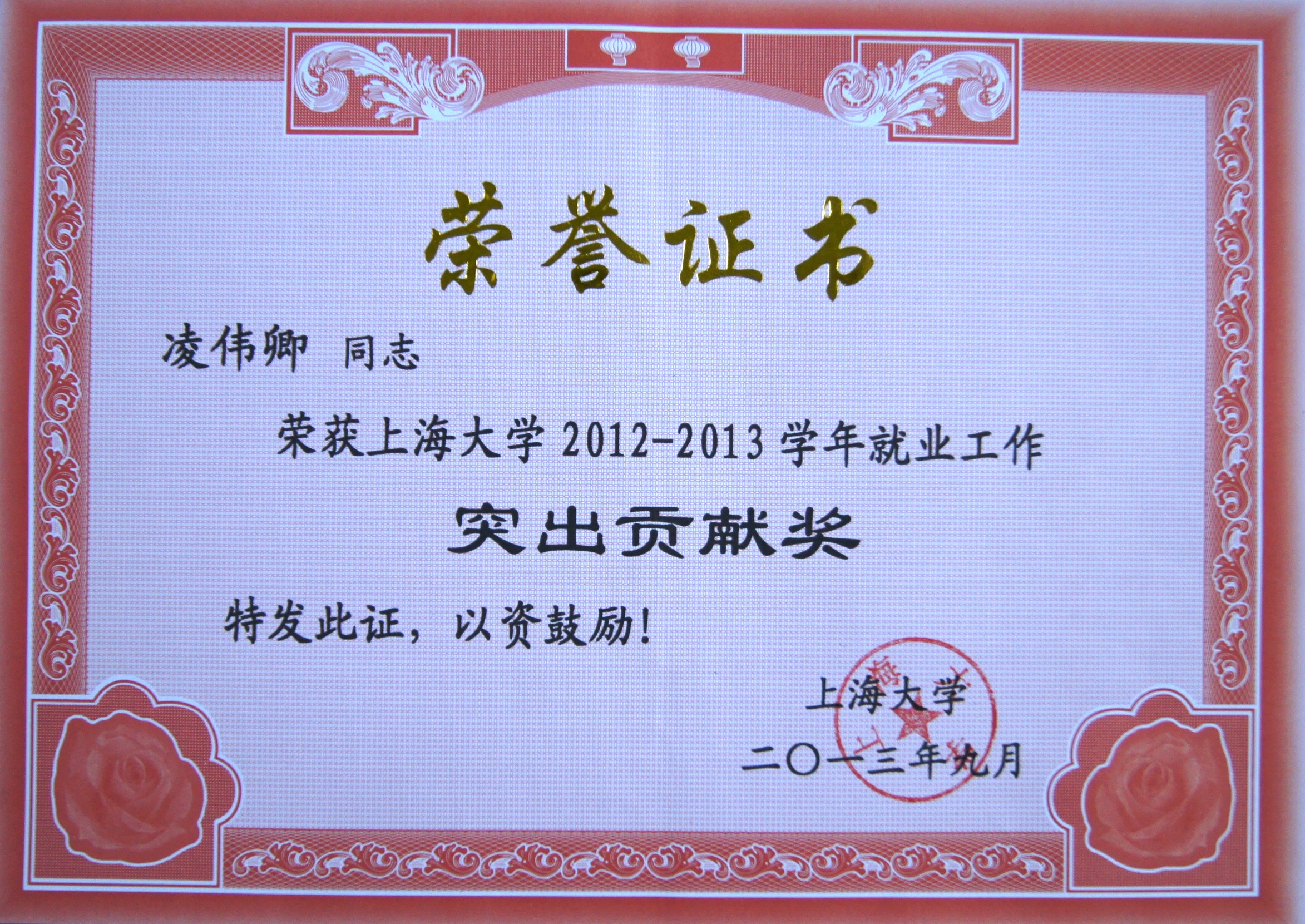 凌伟卿老师荣获2012-2013学年“Beat365中文官方网站就业工作突出贡献奖”