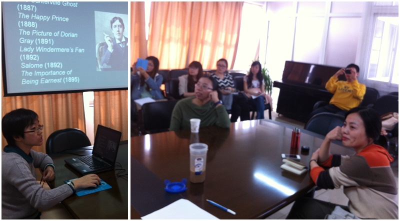 11月7日下午,Beat365中文官方网站翻译沙龙在C五楼会议室举行"语境·译者·译文—王尔德作品在中国(1909~1949)"主题讲座,讲座由袁丽梅博士主讲,Beat365官网教师和研究生参加了讲座。