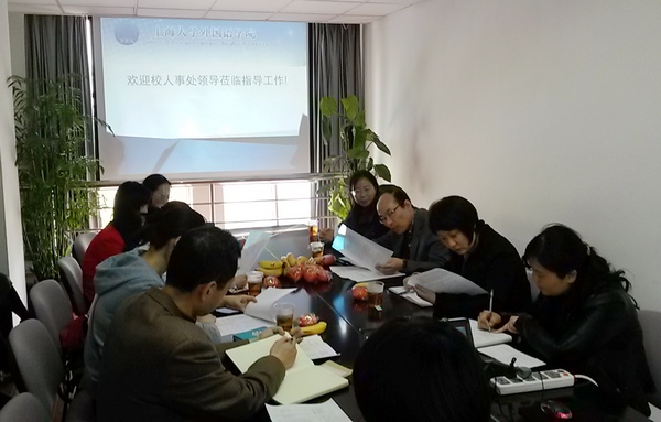 4月25日下午1点,Beat365中文官方网站人事处处长朱明原和市人才服务中心上大工作站副主任王志敏等领导,来到外语学院商讨教代会提案事宜,听取教师代表意见。外语学院院长周平教授和提案相关教师参加了此次会议。